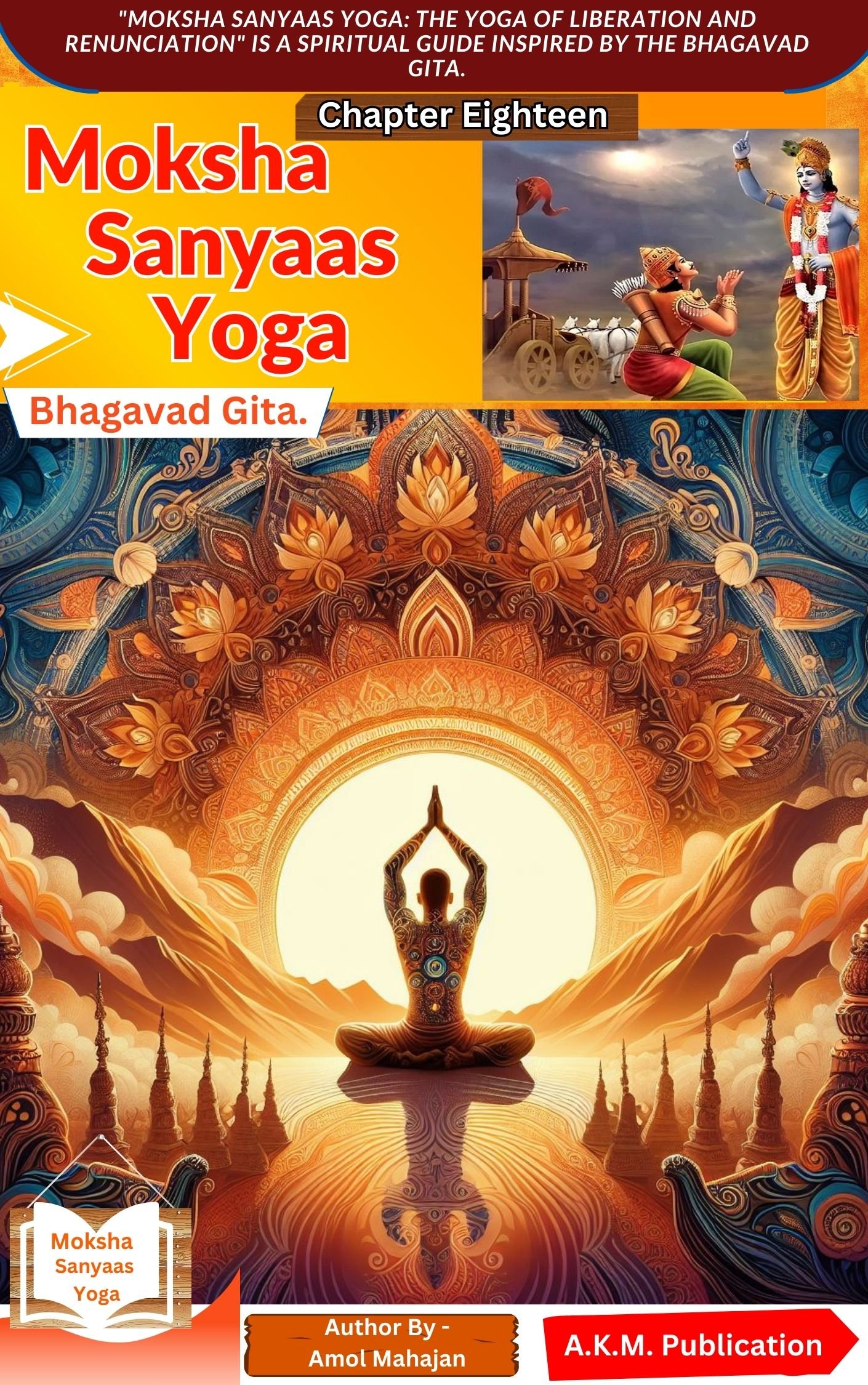 "Moksha Sanyaas Yoga: The Yoga of Liberation and Renunciation" is a spiritual guide inspired by the Bhagavad Gita, where the divine discourse between Lord Krishna and the warrior Arjuna unfolds. Within its pages, readers embark on a transformative journey, delving into the depths of philosophical contemplation and practical wisdom. Through fifteen illuminating chapters, the essence of Moksha Sanyaas Yoga is unveiled, elucidating the path to liberation and renunciation. At its core lies the profound teachings of Krishna, who serves as a compassionate mentor, guiding Arjuna—and by extension, readers—towards spiritual enlightenment. With clarity and insight, this book not only summarizes the main teachings but also provides practical guidance for integrating these timeless principles into daily life. It is a beacon of light for seekers on the quest for inner peace, self-realization, and ultimate liberation.