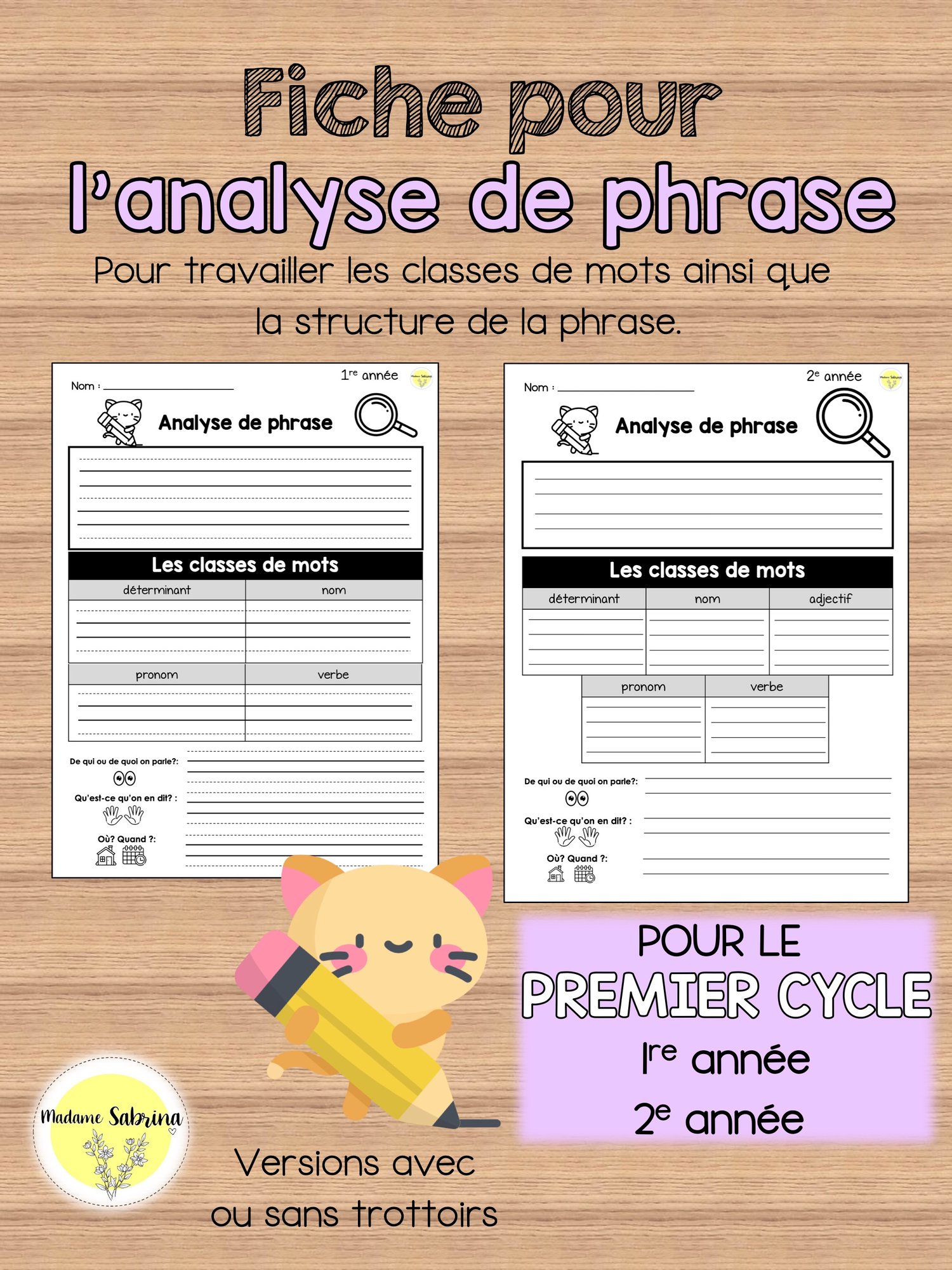 Ce document d’analyse de phrase a été conçu spécialement pour les élèves du 1er cycle (1re et 2e année) afin de développer progressivement leur compréhension de la structure de la phrase ainsi que les classes de mots.