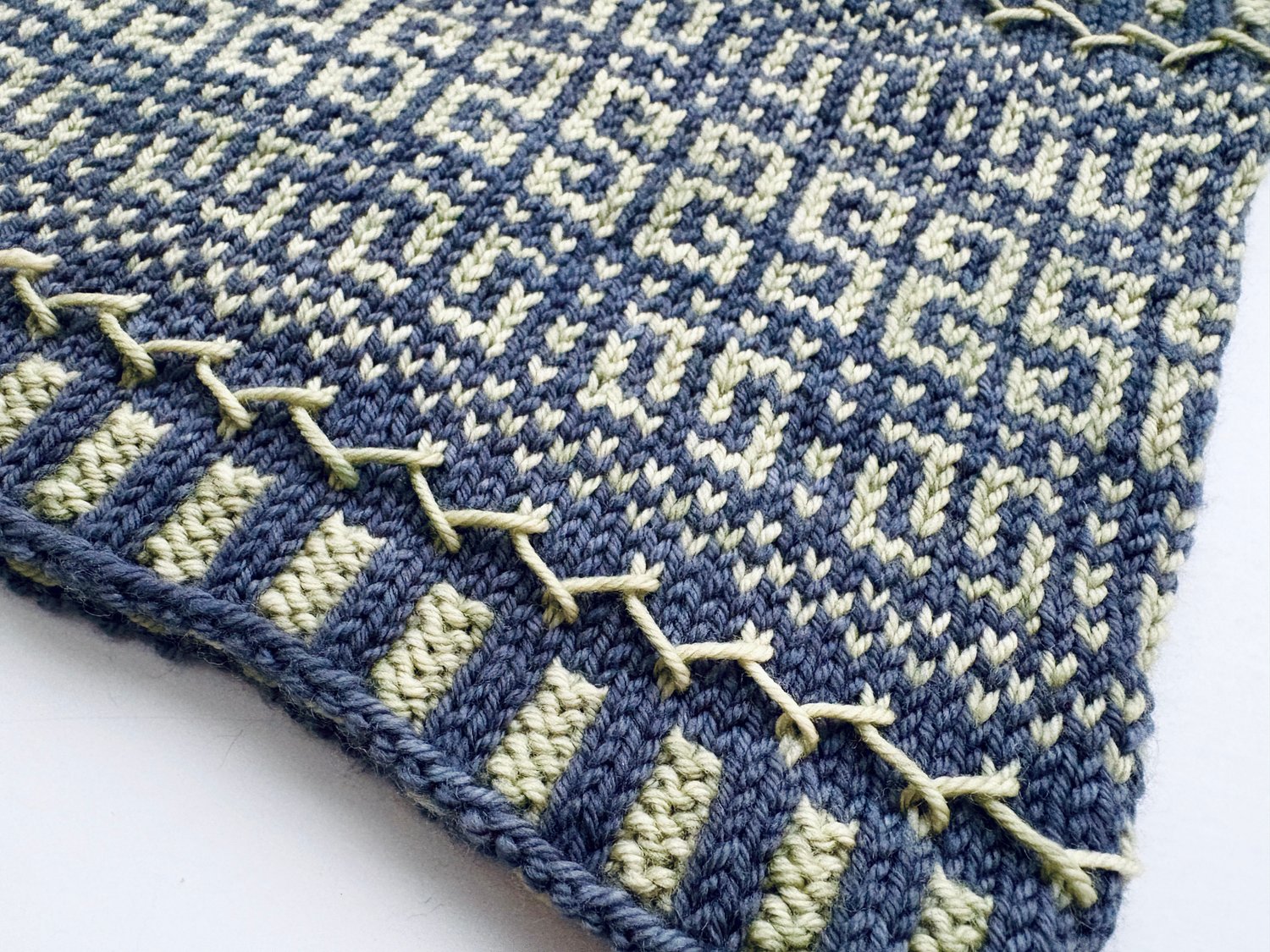 The stranded motif is charted only, with two versions of the chart provided so you can choose the one that best matches your main color.