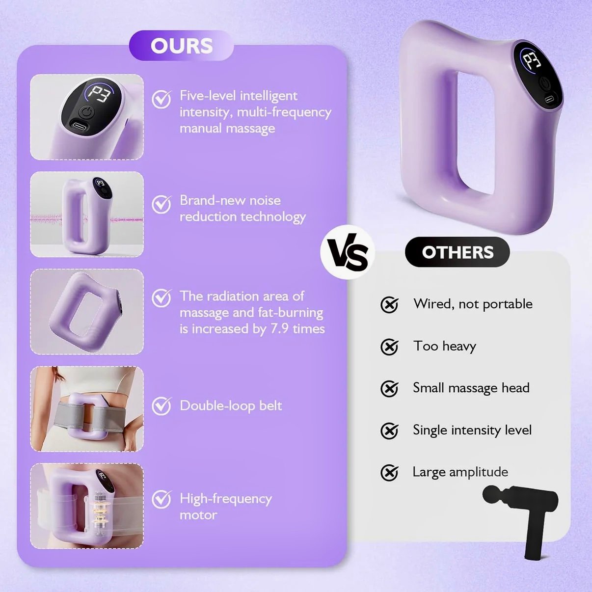 FeatureDetailMaterialHigh-Grade PP & Skin-Safe SiliconeColorsBlossom Pink, Blue, purpleChargingUniversal Type-C (5V)Motor Power30W High-Torque Eccentric MotorTarget UsersAthletes, Office Professionals, Seniors, Fitness Enthusiasts