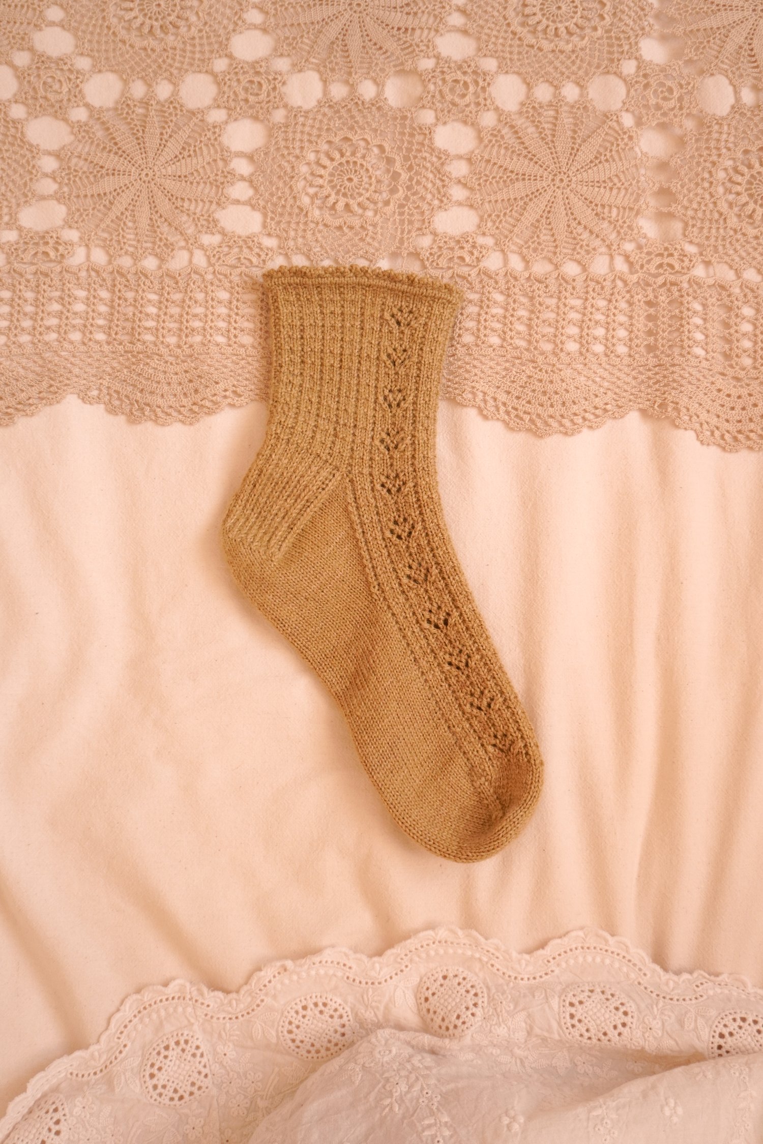 The sample is worked in Karlie Paige Fibre Co. BFL Sock colorway Golden Olive (100% Blue Faced Leicester; 337 m / 369 yds – 100 g).