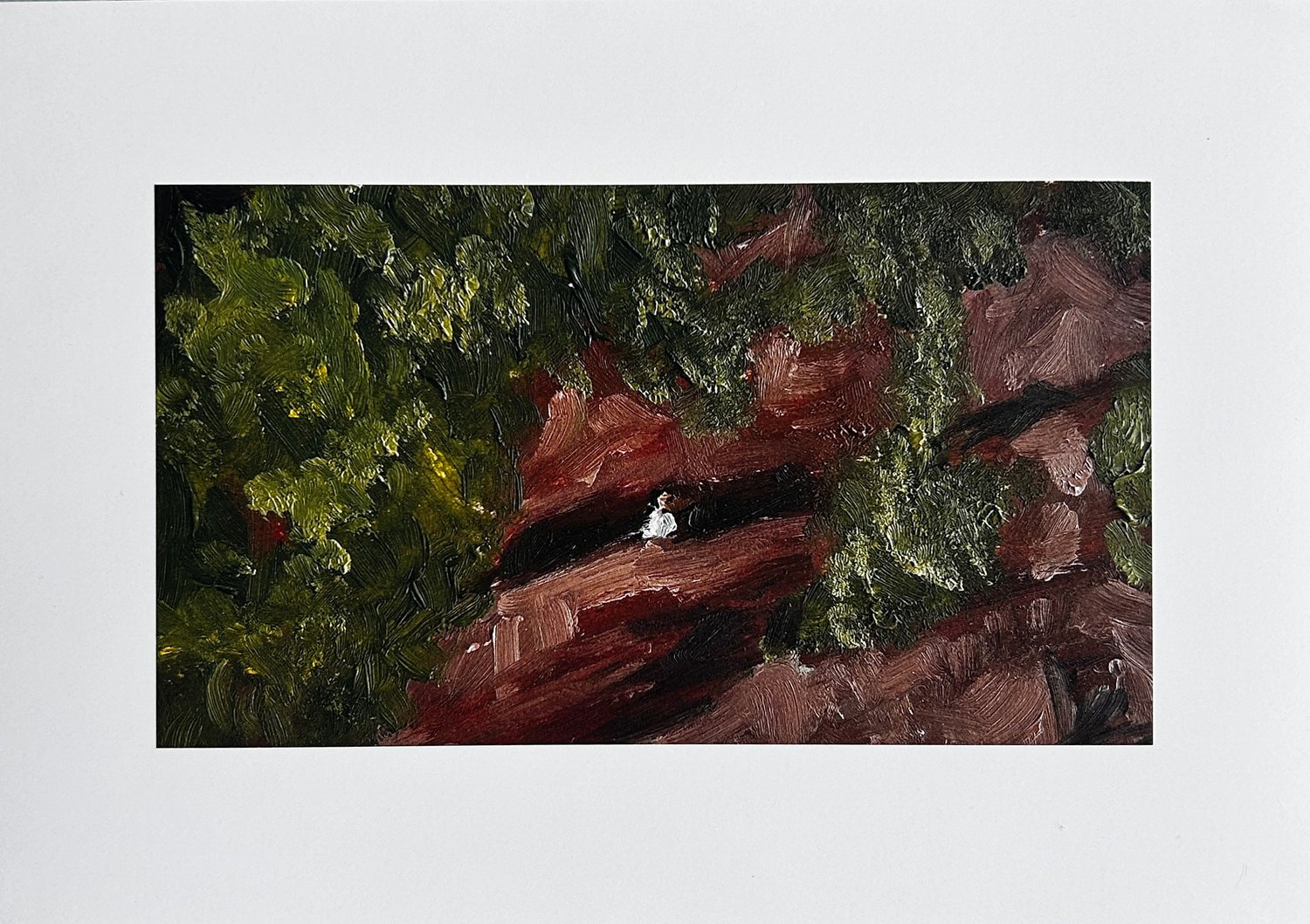 The original was painted in oil and inspired by the work of Patrick Fraser Allan, whose moody, earthy landscapes really stuck with me. I tried to capture some of that same texture and feeling here – the contrast of the bright puffin against those deep red rocks and thick greenery.