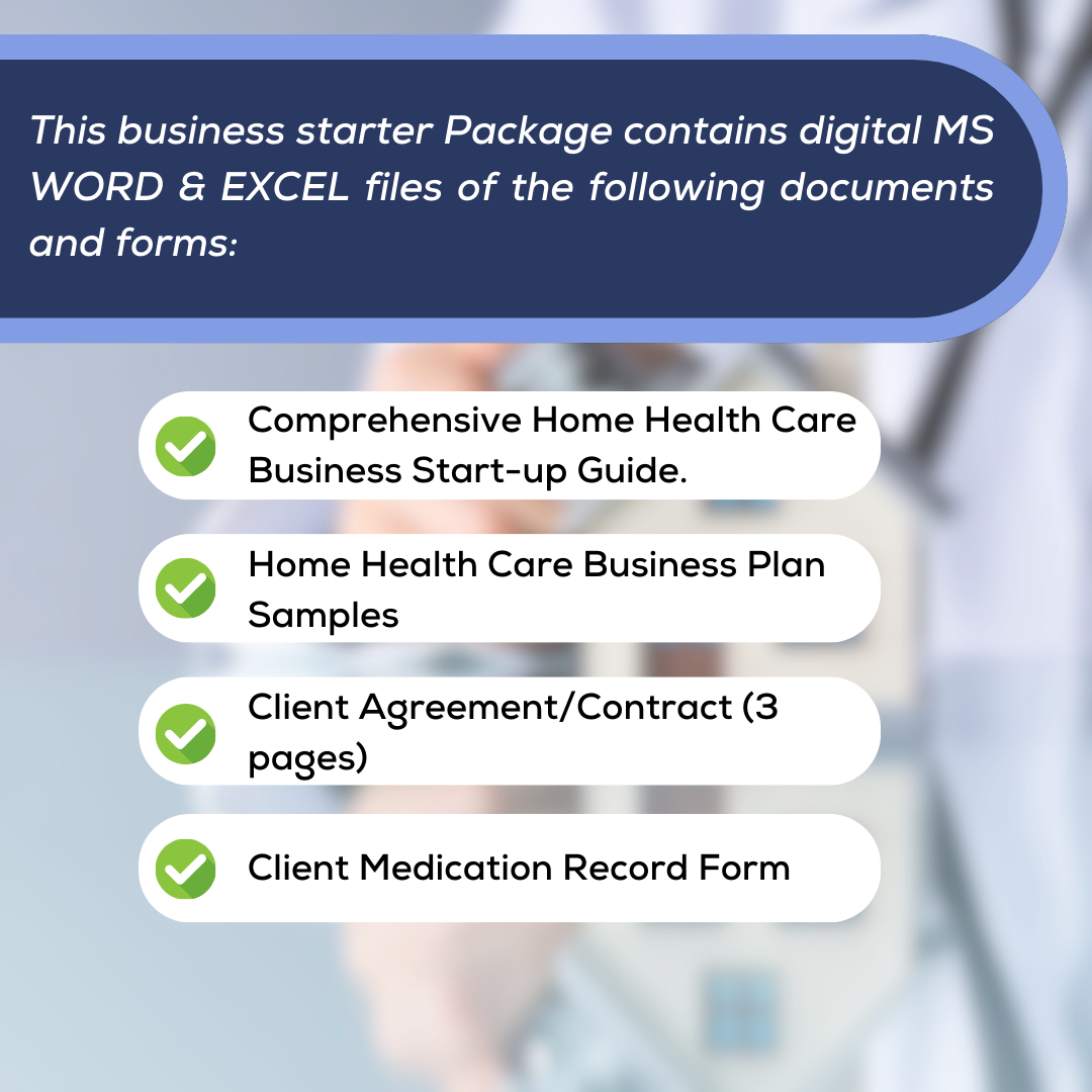 This comprehensive home healthcare start-up guide, business plan samples, business plan guides, manuals, forms, and template package offers information and an array of tools specially designed for delivering medical or non-medical home care support services.