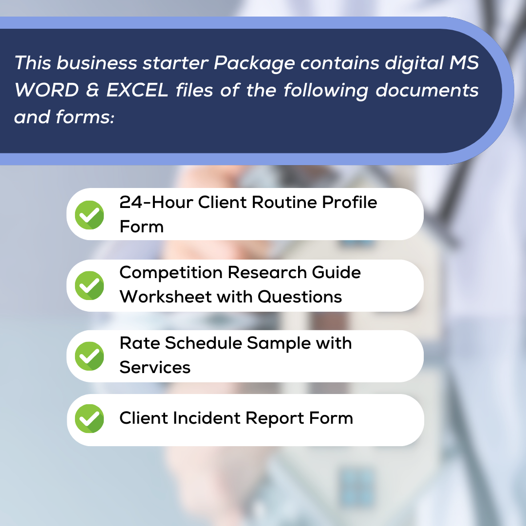 This home care agency start-up kit includes over 183 professionally developed and formatted home care forms and templates in MS WORD and EXCEL. Each form is completely customizable to your business, so you can add your logo and address and change or remove any wording to fit your unique business.
