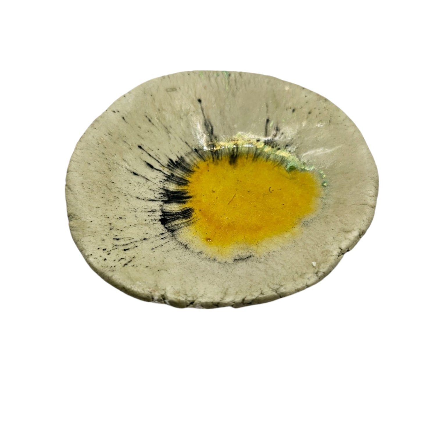 Hand made combining air dry clay, sunflower pollen, pigments and resin.