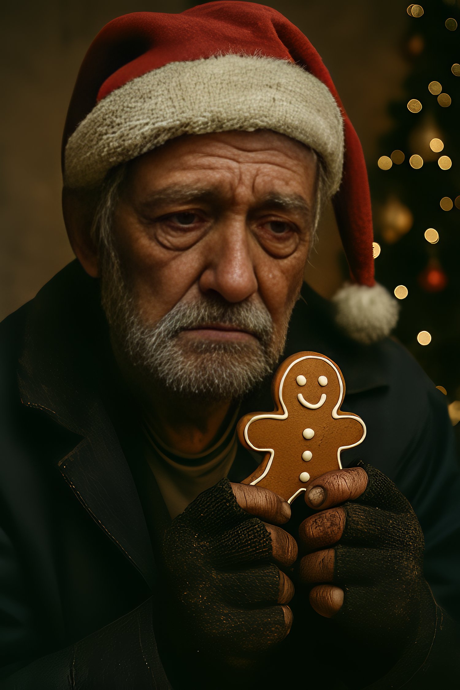 A close-up portrait of an elderly man wearing a Santa hat and fingerless gloves, holding a gingerbread man cookie with a somber expression. Warm holiday lights softly glow in the background, creating a poignant contrast between the festive setting and the emotional depth of the scene.