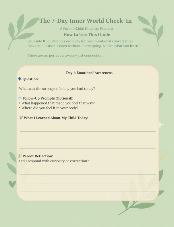 The 7-Day Inner World Check-In is a guided reflection printable designed to help parents slow down and explore their child’s emotional world through one intentional conversation each day.