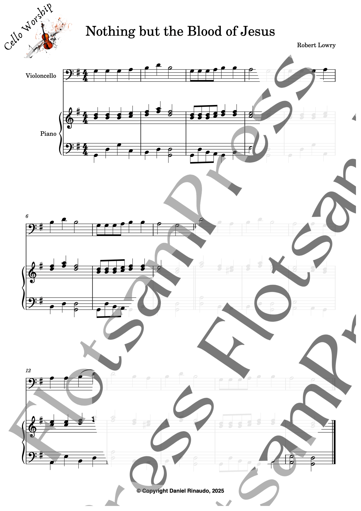 This arrangement of Nothing but the Blood of Jesus is written for beginner to lower-intermediate cello players, with a simple and supportive piano accompaniment. Perfect for church services, lessons, or home practice.
