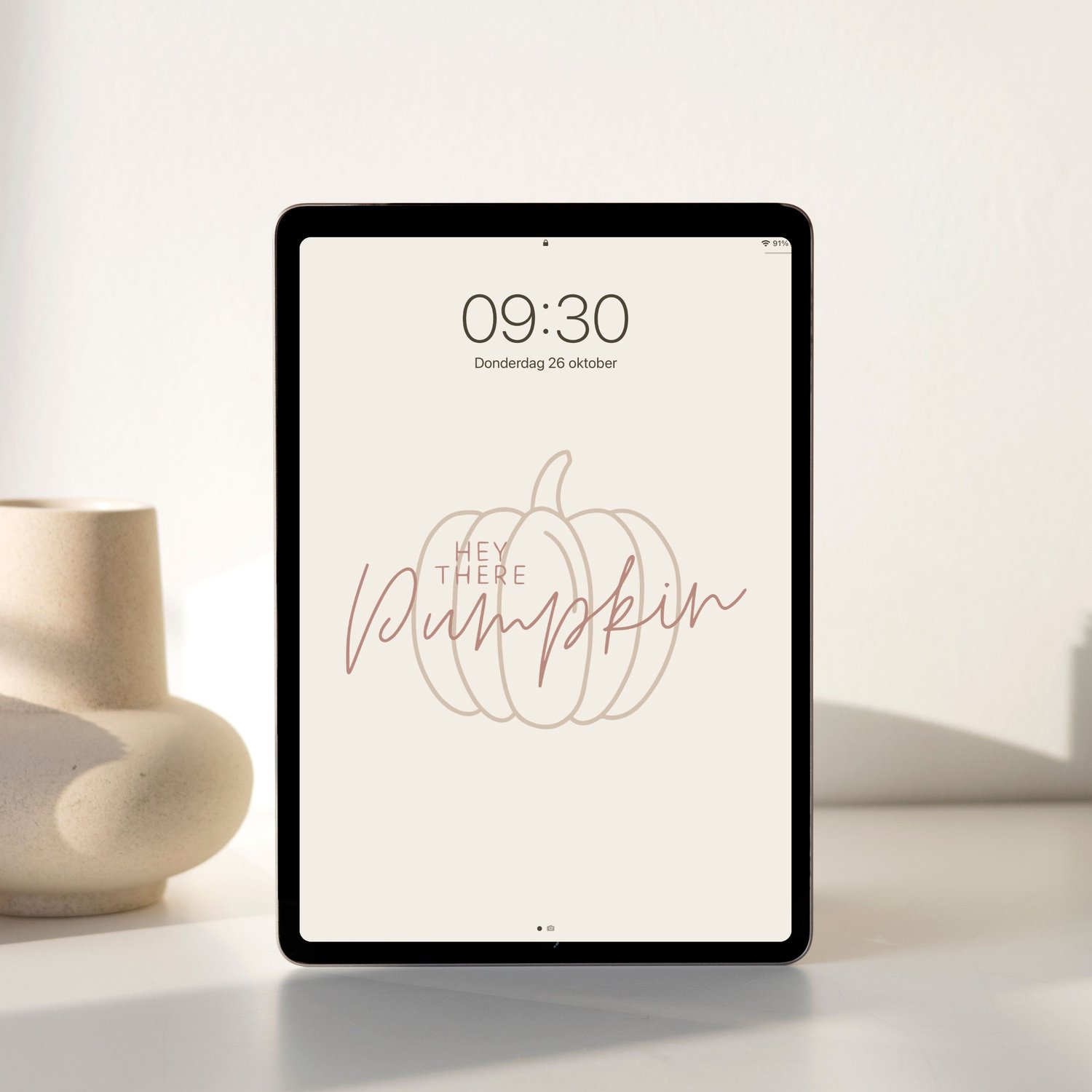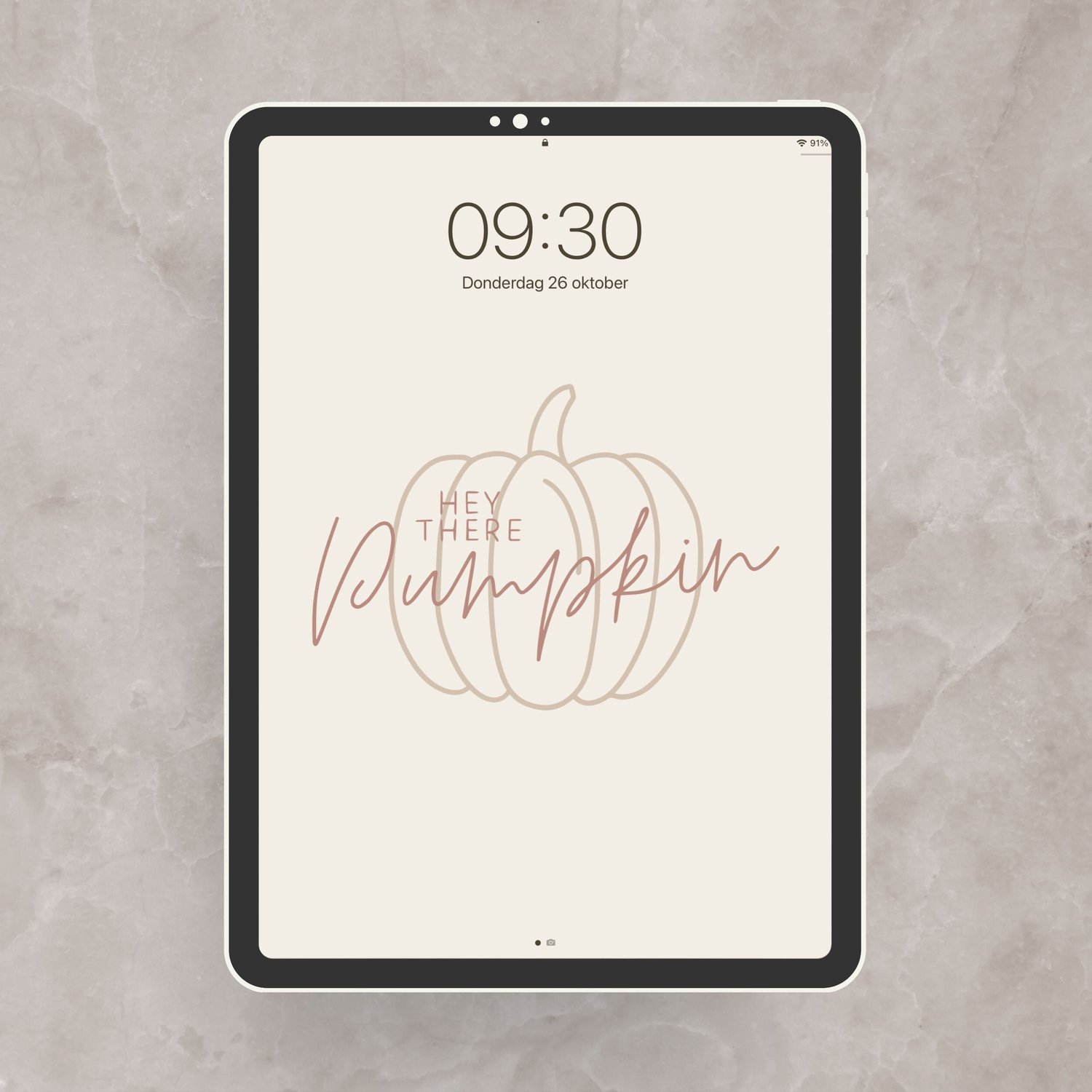 //Cozy Autumn iPad Background with 'Hi Pumpkin' Text and Pumpkin Illustration in Soft Beige-Pink Hues//