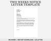 Two Weeks Notice Letter Template, 2 Weeks Notice Letter, Resignation Letter Template, Letter of Resignation, Notice Period Letter