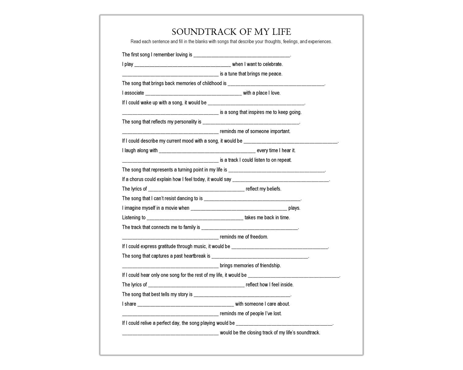 Bring a little fun and reflection to your day with this Soundtrack of My Life worksheet. This resource features 30 prompts that help you think about the songs that mark your favorite moments and memories. It’s a sweet way to celebrate who you are and what music means to you. Ideal for journaling, classroom activities, or a cozy self-care night.