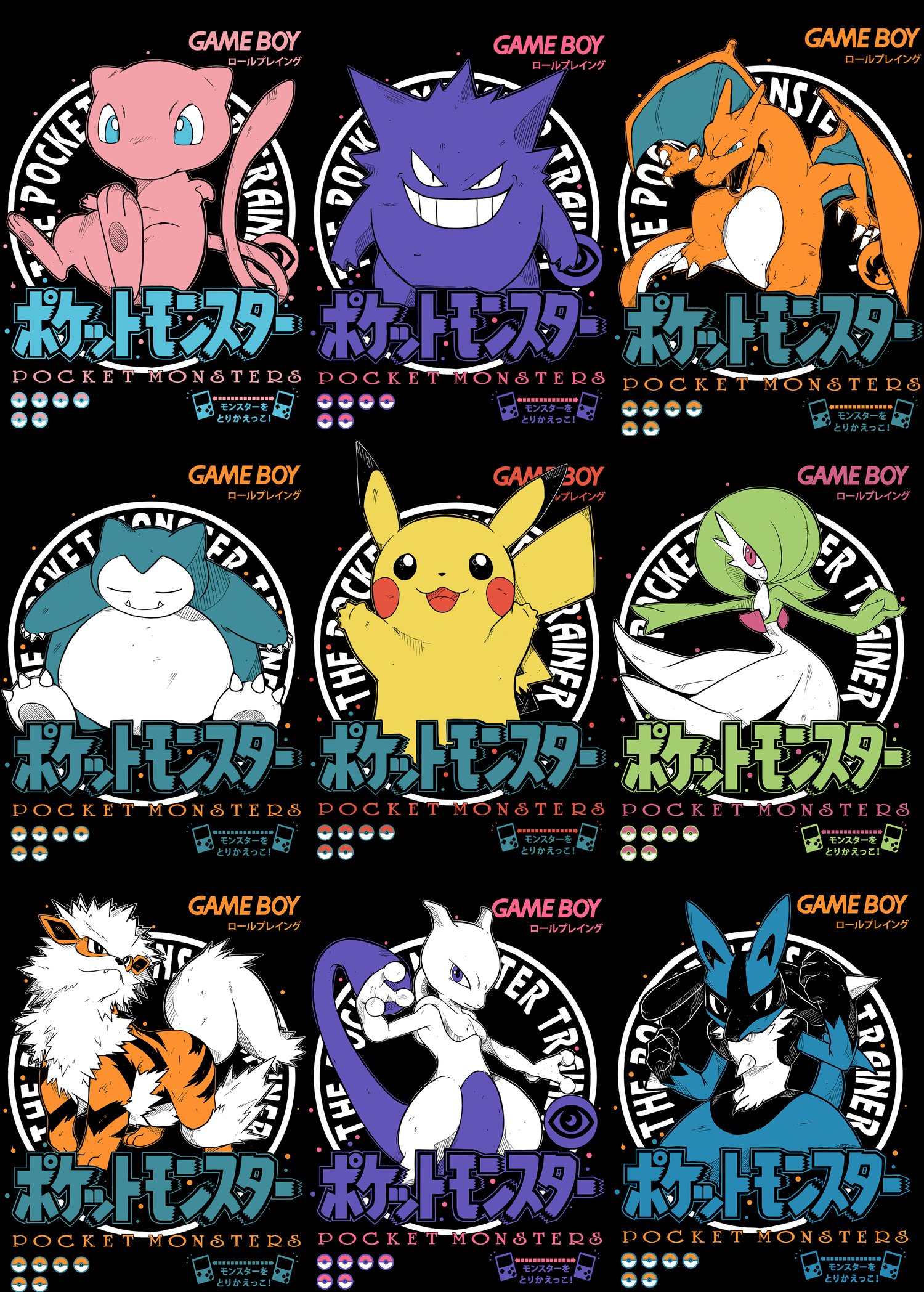 Diseño digital en alta resolución, inspirado en la fuerza, el estilo y la oscuridad de los personajes más icónicos de Pokemon: Mew, Gengar, Charizard, Snorlax, Pikachu, Gardevoir, Arcanine, Mewtwo, Lucario.