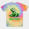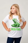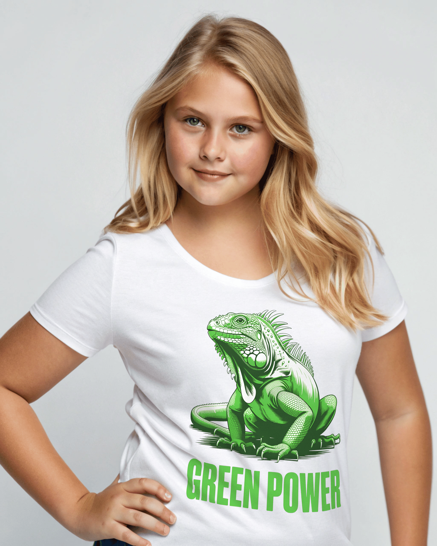 A stylized illustration of a green iguana is centered in the image. The iguana, depicted with intricate line art, shows detailed scales and body structure. It is rendered in a vibrant, glowing neon green, contrasted against a white background. The iguana is posed in a semi-profile view, with its head turned slightly towards the viewer, and tail curled. The artwork features a distinct graphic style reminiscent of a screen-printed design. Below the iguana, the word "Green Power" is printed in the same bright green font, further emphasizing the illustration's location or theme. The lighting is even, illuminating the iguana’s details without significant shadows or highlights. The overall composition is simple and graphic, creating a bold and eye-catching design. The image is intended for a design or merchandise.