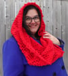 This cowl/poncho pairs a delicate lace motif with a bulky yarn–the lace paired with the bulky yarn creates a bold and striking design. It can be worn doubled up around the neck, as a hood, or around the shoulders like a poncho.