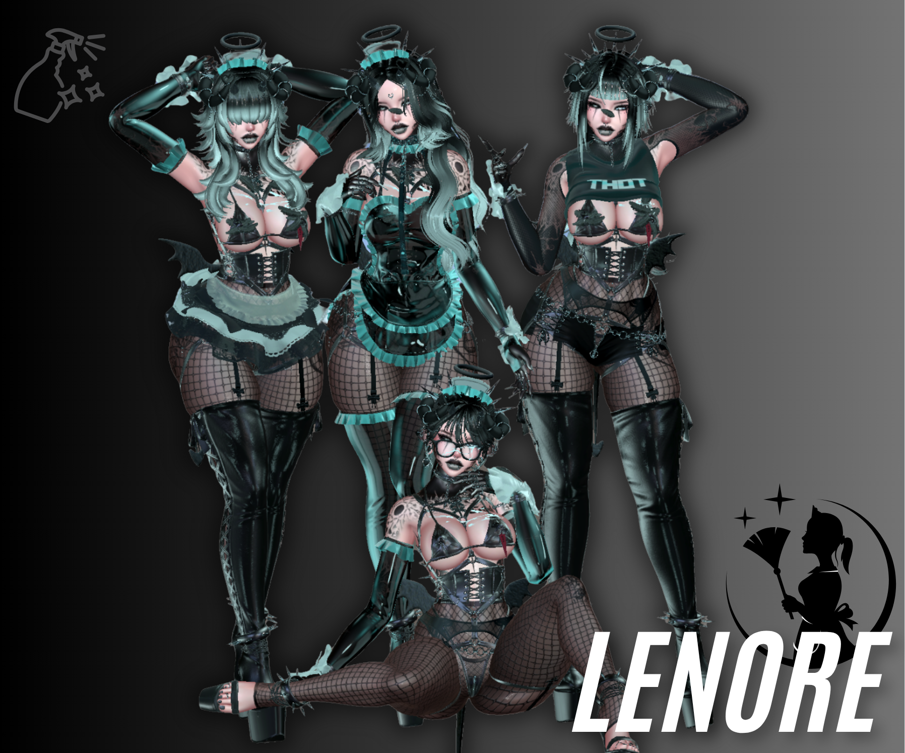 Body (Edit by me no reuse),ย Face (Edit by me no reuse), Maid sleeves / dress / stockings, Shirt, Skirt / Gloves / Feathers / Maid headpiece / Bun 1 / Duster, Shorts, Hip Chain, Apron, Bracelets / Harness, Corset, Leash, Garter belt, Milk / Bigger Glasses, Glasses, Piercings, Mouth panties, Spiked headband, Jara hair, Ponytail / Wavy hair / Bun 2, Pigtails, Big bangs hair / Short hair / Pasties, Tail / Wings / Halo / Corset Laces / Bra/ Earrings/ Panties, Boots, Heels, Big horns, Tats face / Body, Eye texture, Face texture, Spray bottle, Small horns and platter made by me (PinkyChan)