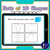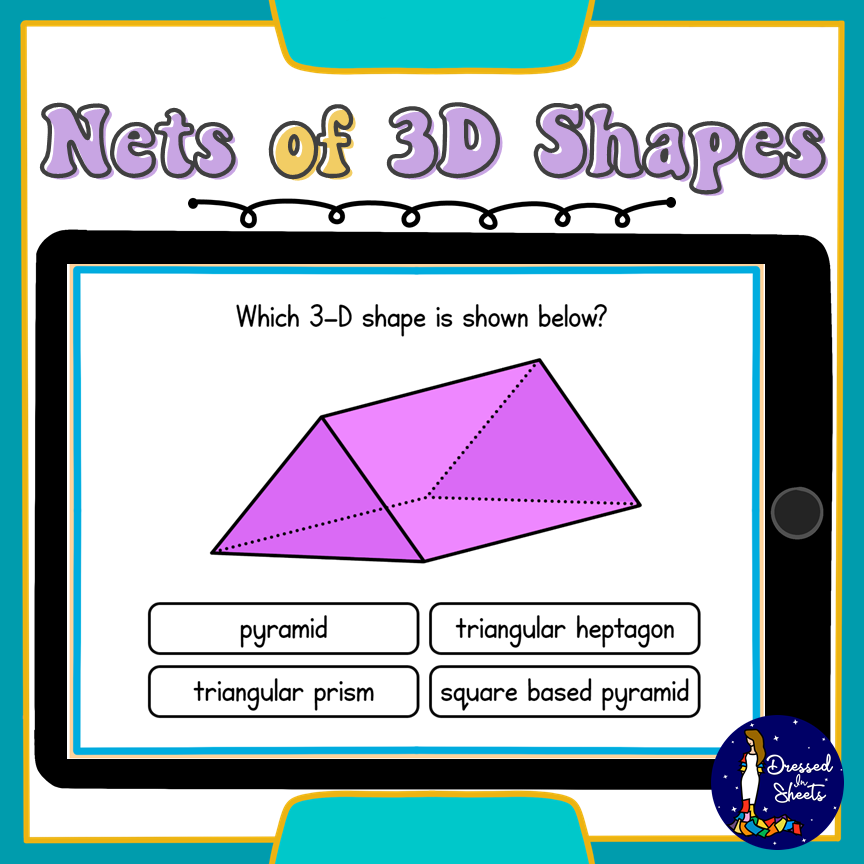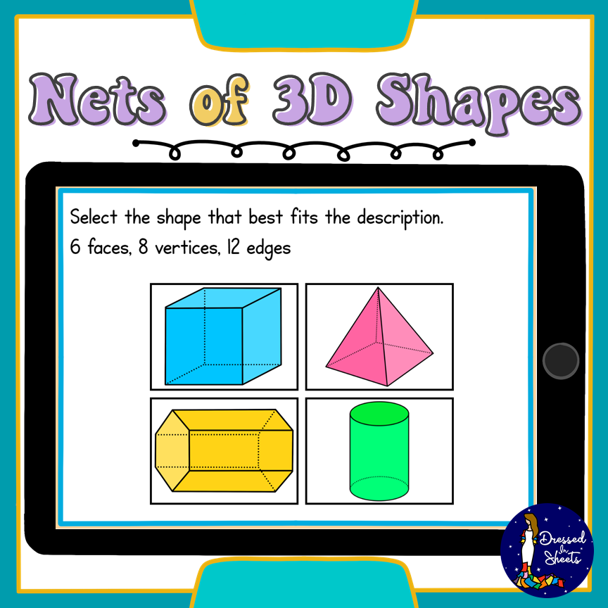 Can you tell which net makes the 3-D shape shown? Let's put your wit to the test! You will also get to match 3-D shapes to their names and try to find out what 3-D shape is being described when given the number of faces, vertices, and edges.