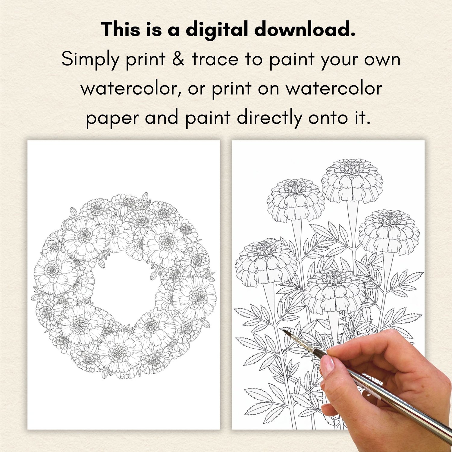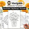 🌼 20 Marigolds Watercolor Templates & Digi Stamps — Print, Trace & Paint! 🎨