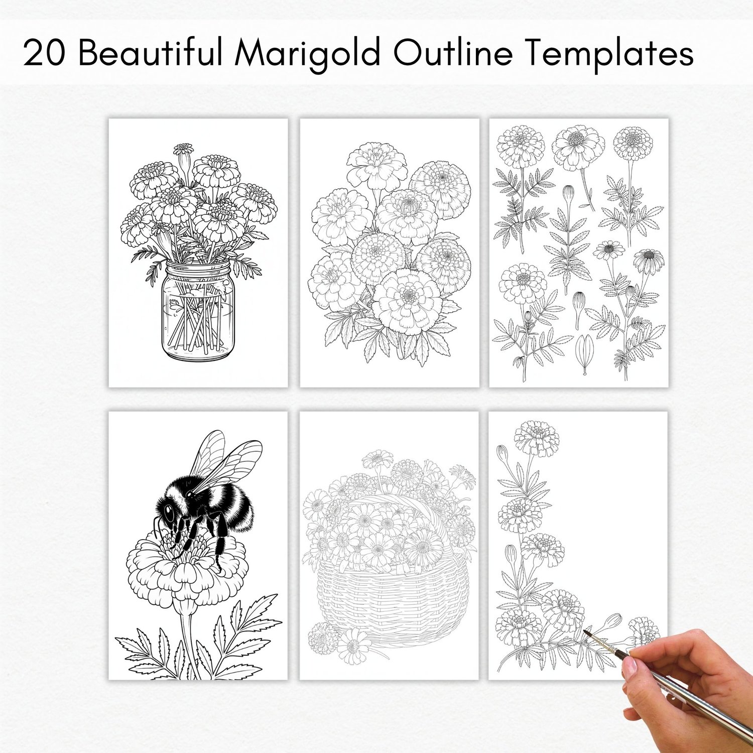 • 20 unique marigold designs as printable PDF outlines