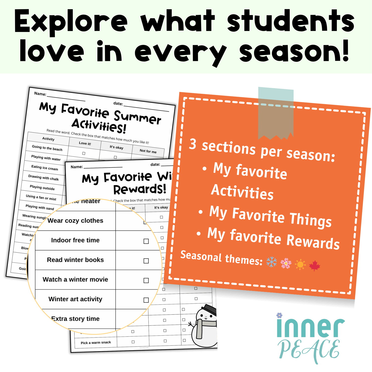 This fun and visual survey helps students share their favorite activities, things, and rewards for winter, spring, summer, and fall. Perfect for SEL, behavior support, and student motivation!