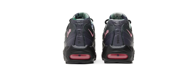 Lancée dans le cadre d'un pack collaboratif de trois pièces, la Corteiz x Nike Air Max 95 'Pink Beam' présente un schéma de couleurs furtif avec des touches de couleurs vives. Le laçage à cordon fixe la tige en cuir, finie dans des tons bleu marine et gris foncé et contrastée par une série de marques roses. Il s'agit notamment du mot-symbole Corteiz brodé et du logo Alcatraz de la marque sur la languette. À l'intérieur de la chaussure, la doublure et la semelle intérieure sont recouvertes d'un imprimé camouflage vert et gris d'inspiration militaire. La chaussure est montée sur une solide semelle intermédiaire en polyuréthane noir, équipée d'unités Max Air teintées de fuchsia pour une conduite confortable.