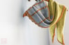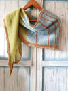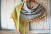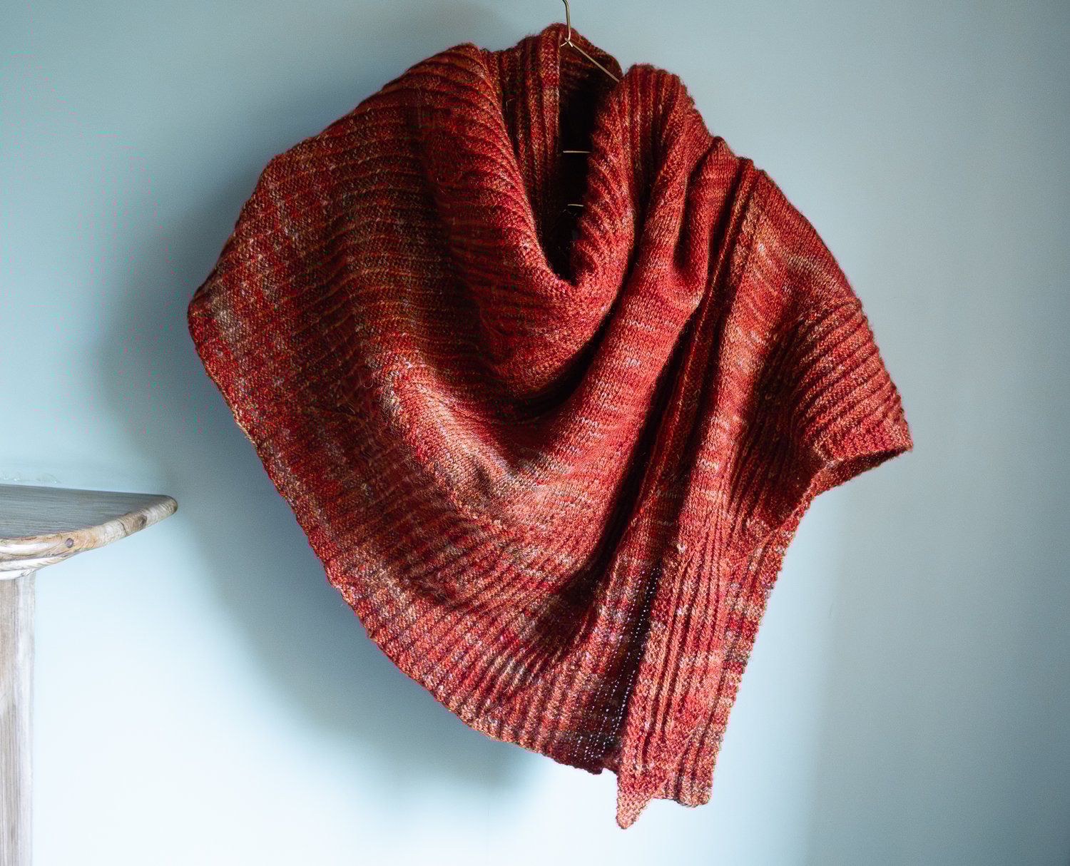 This trapezoid-shaped wrap is knit sideways from end to end and is worked in 3 sections. Stitches are then picked up to work a small decorative border along the bottom edge, and finally, an applied i-cord along the top edge of the wrap.