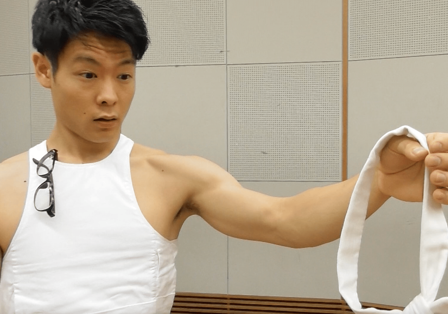 Kamiya is first frozen during a break while drinking, his body titled back and forth. Later, he is frozen and his bandana, glasses and sticks are taken. Finally, he is frozen while changing and cannot help himself keep smiling at the camera.