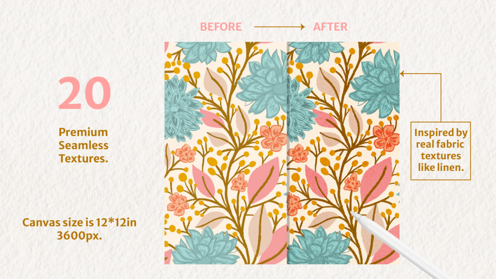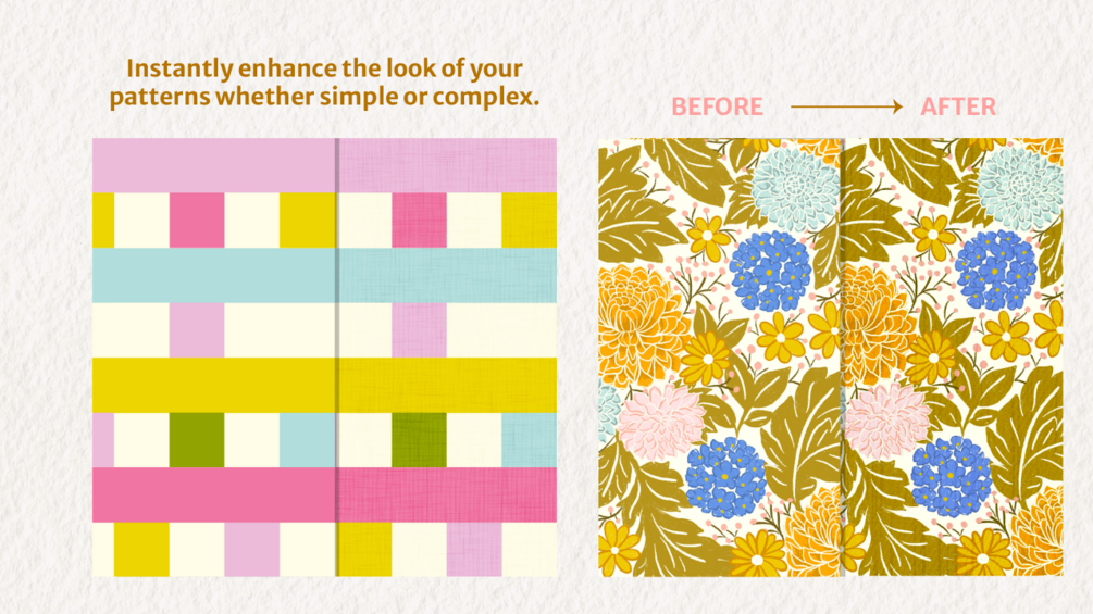 - It’s hassle-free and allows you to spend more time crafting your patterns without worrying about adding textures and ensuring they repeat.