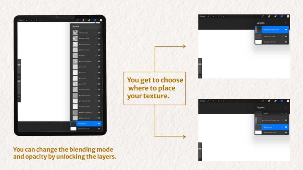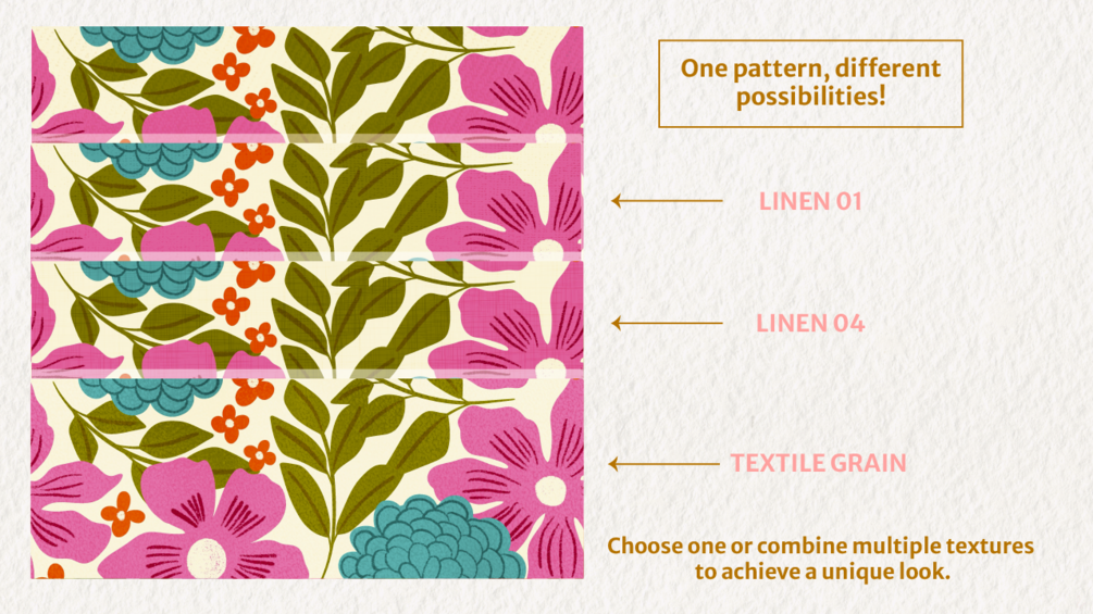 You can use these textures on your patterns by adding one or combining multiple textures. You can also vary the blending modes and opacity to achieve a unique look and add more depth to your repeats.