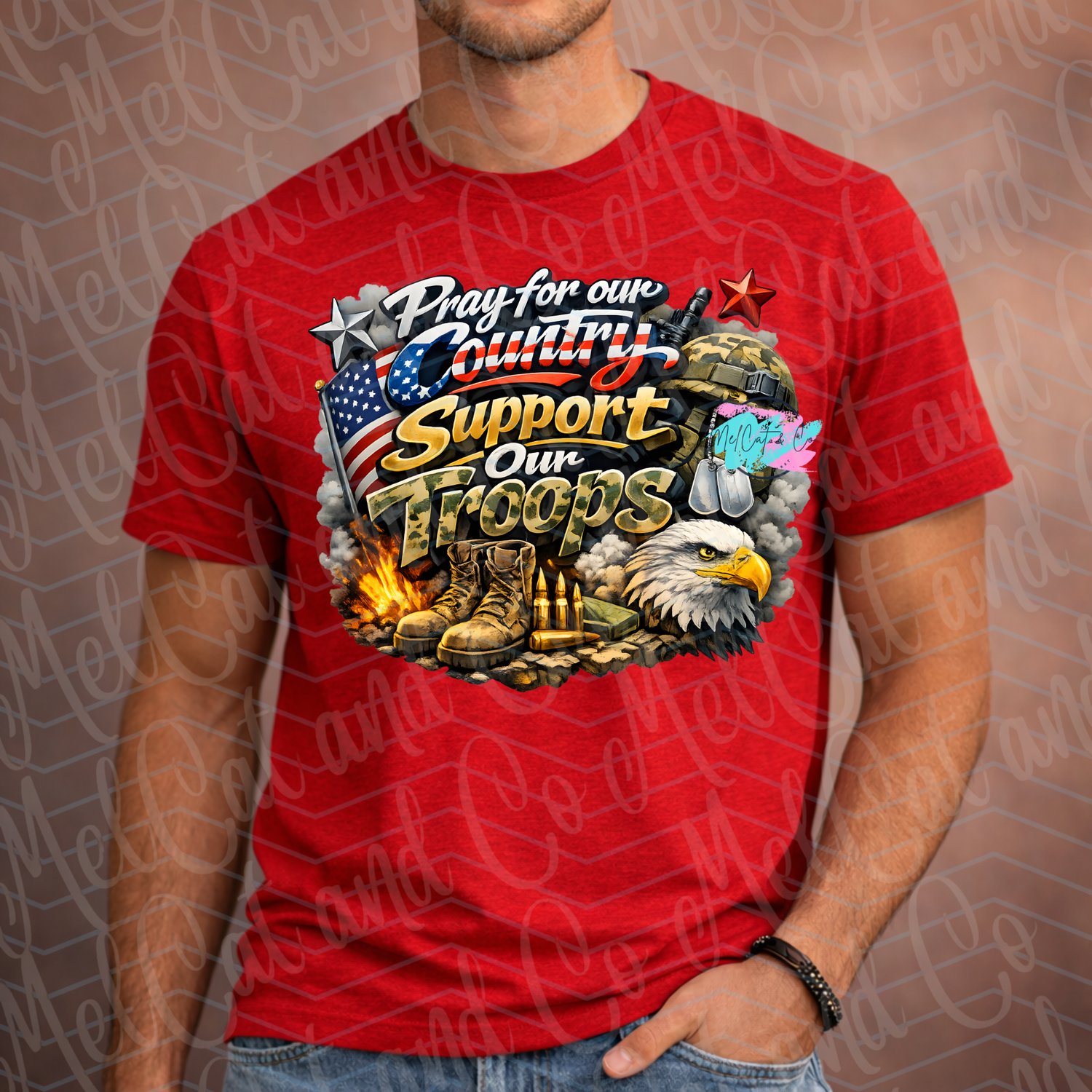 Show your love for America and honor the brave men and women who serve with this powerful “Pray for Our Country, Support Our Troops” patriotic PNG design. This bold 3D graffiti-style military graphic features iconic American symbols including the American flag, combat boots, dog tags, bald eagle, bullets, and military helmet, creating a high-impact design that truly pops on apparel.