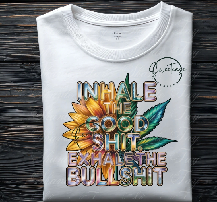 Make a bold statement with this vibrant “Inhale The Good Sht, Exhale The Bullsht” 420 PNG design featuring a stunning sunflower and detailed cannabis leaf artwork.
