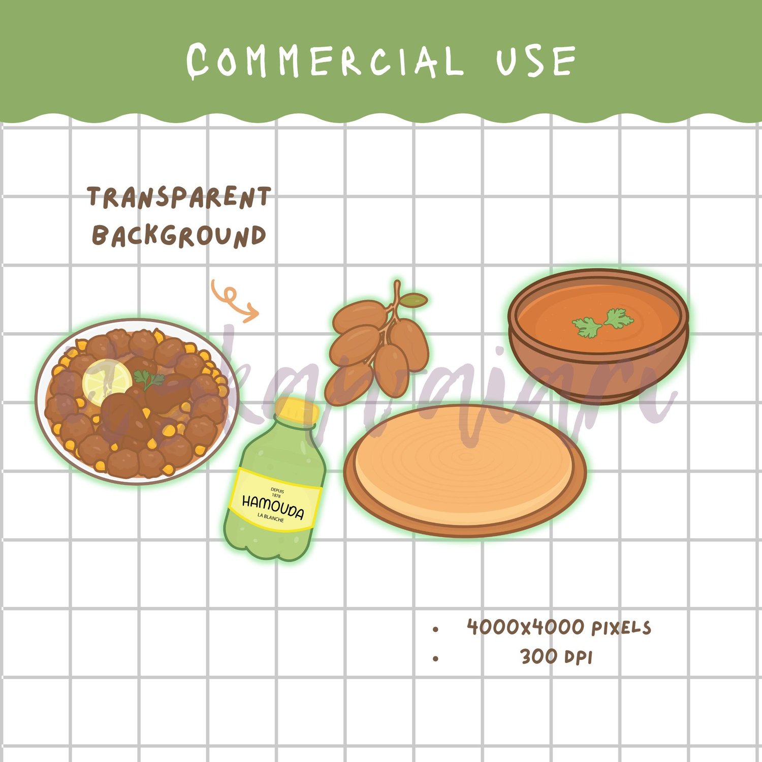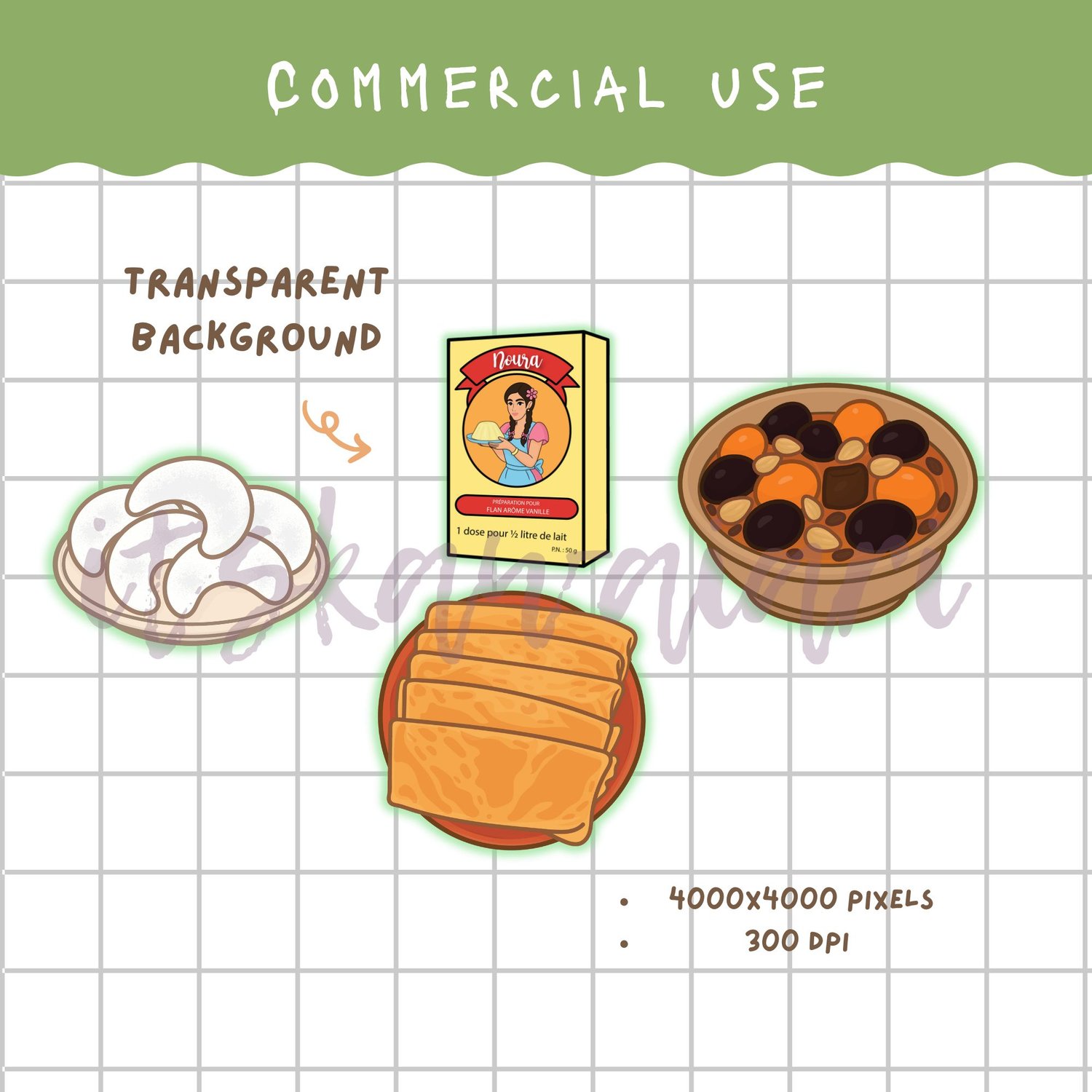 Algerian Clip Art Bundle | Chibi Girl in Hayek & Khait Elrouh, Algerian Food & Desserts | PNG For Commercial Use