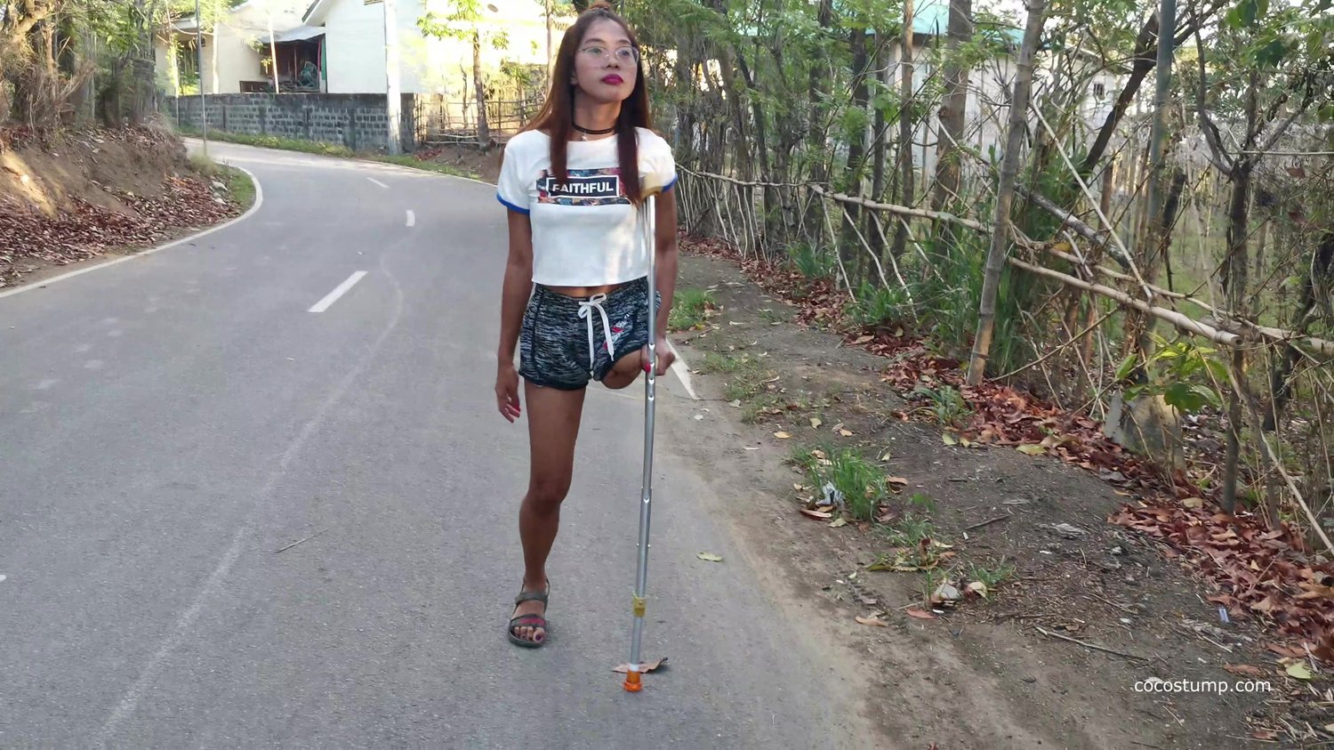 Watch Janin the awsome left above knee amputee with a tiny stump, while crutching along the street and the field with a single underarm crutch. Fantastic close up scenes of her lovely stump. 20 min, 2160p.