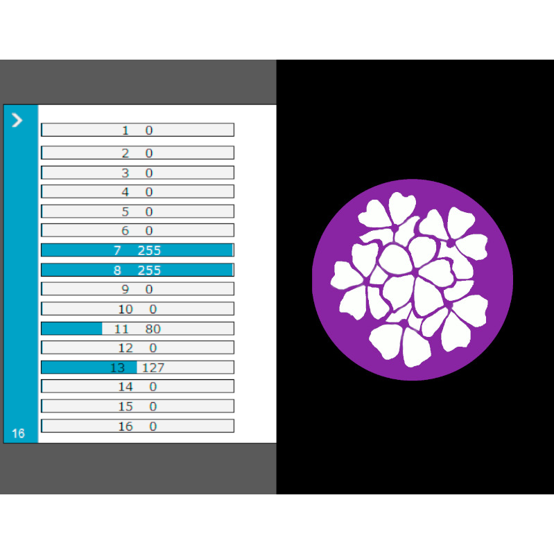 * Verifique, con un Fixture de pruebas (click), que coincidan estos canales: 8 Dimmer, 7 Strobo/Shutter, 11 en el valor 80 = Gobo de Flores con fondo Violeta, 13 Foco (ver tercer foto).