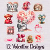 Cute valentines bundle, 12 of the most popular designs - includes couples, animals, photo templates. 12 love designs to personalise. Sublimation or print. Transparent PNG.