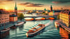 This artwork captures the magic of Gamla Stan (Old Town), featuring its cobblestone streets, medieval churches, and iconic city skyline bathed in the golden glow of the setting sun. The Riddarholmen Church, with its soaring spire, stands prominently in the background, while a sleek glass-roofed tour boat cruises through the tranquil waters, carrying visitors through Stockholm’s breathtaking waterways.