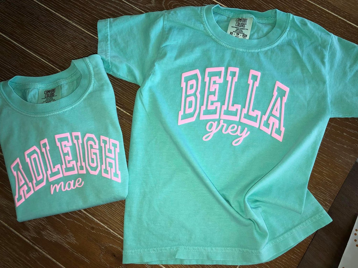 This custom name shirt is made to order and a Comfort Colors (chalky mint color) brand shirt. It's perfect for a "MAMA" "NANA" "AUNTIE" etc. shirt!