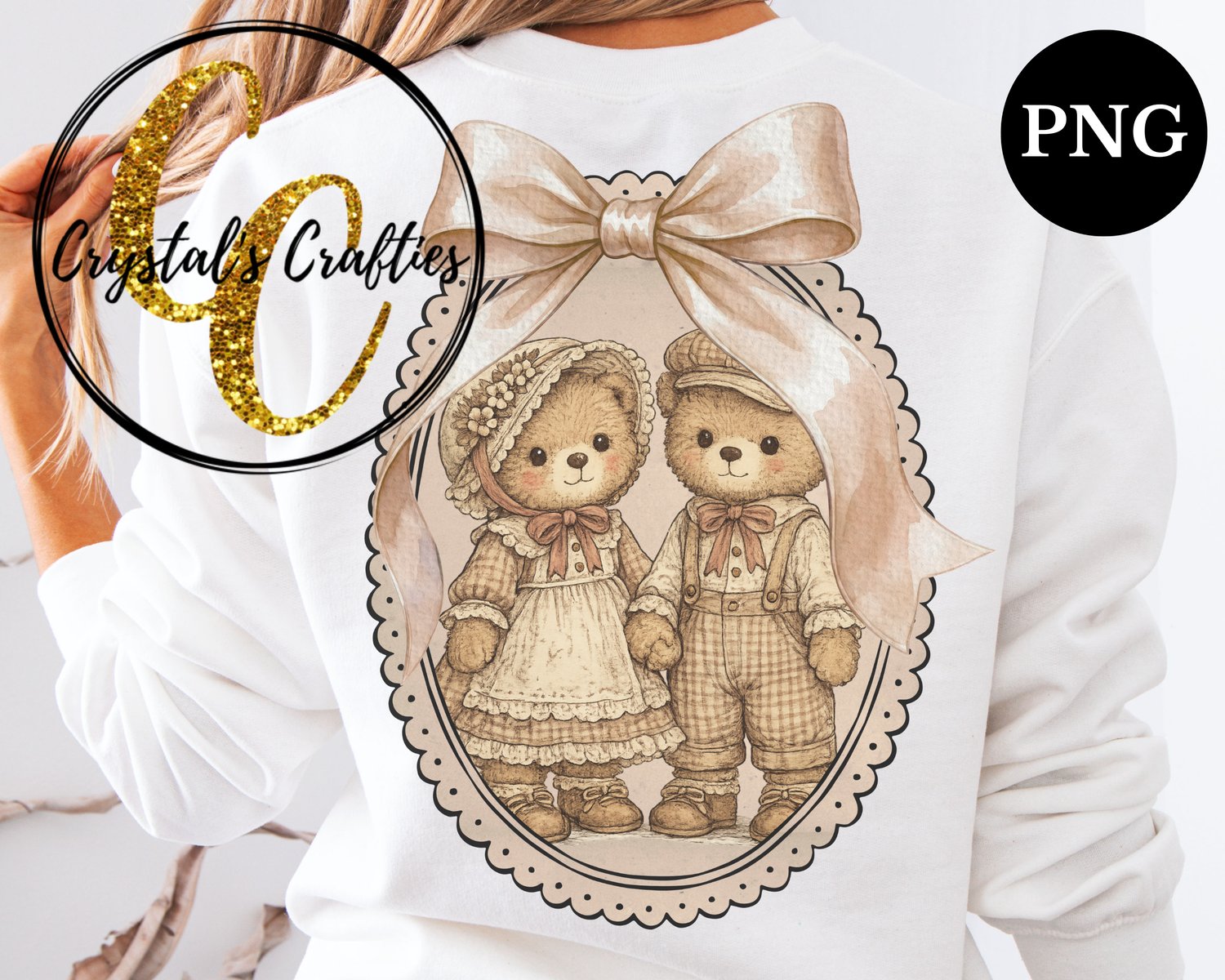 Add a sweet storybook touch to your designs with this charming vintage teddy bear pair PNG! This hand-drawn illustration features an adorable boy and girl teddy bear holding hands, dressed in timeless vintage-style clothing and placed inside a soft cottagecore oval frame finished with a delicate bow.
