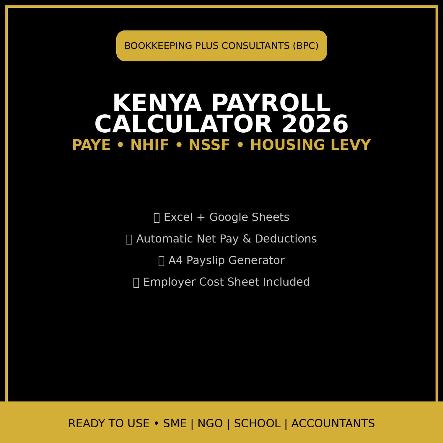 Bookkeeping Plus Consultants (BPC) Kenya Payroll Calculator 2026 is a ready-to-use payroll tool for SMEs, NGOs, Schools and Accountants. It calculates: