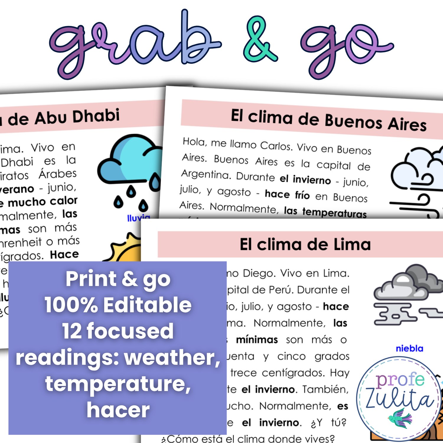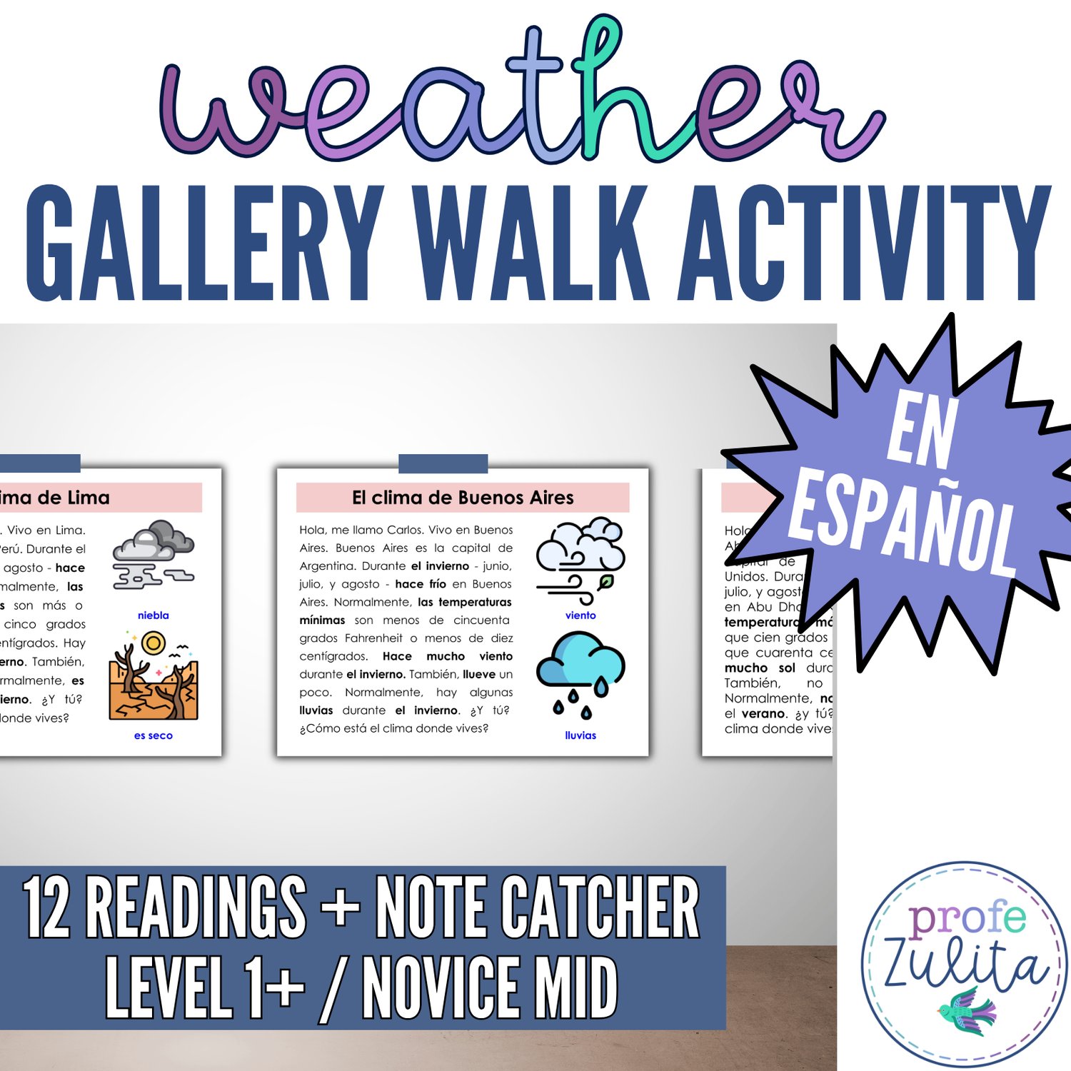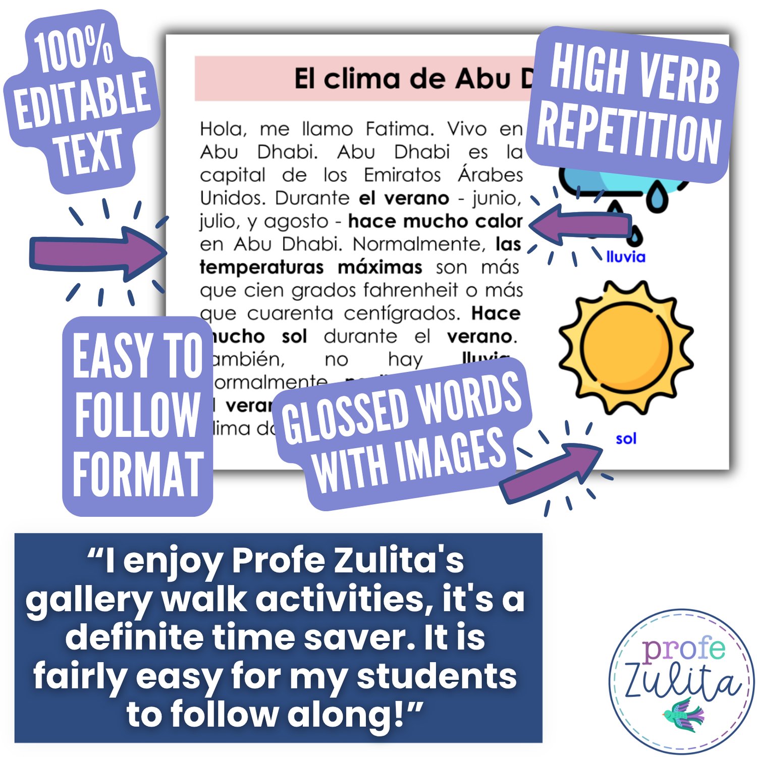 This gallery walk will provide your students with 12 focused readings written to provide structured input with Spanish weather vocabulary & structured phrases used with weather in Spanish.