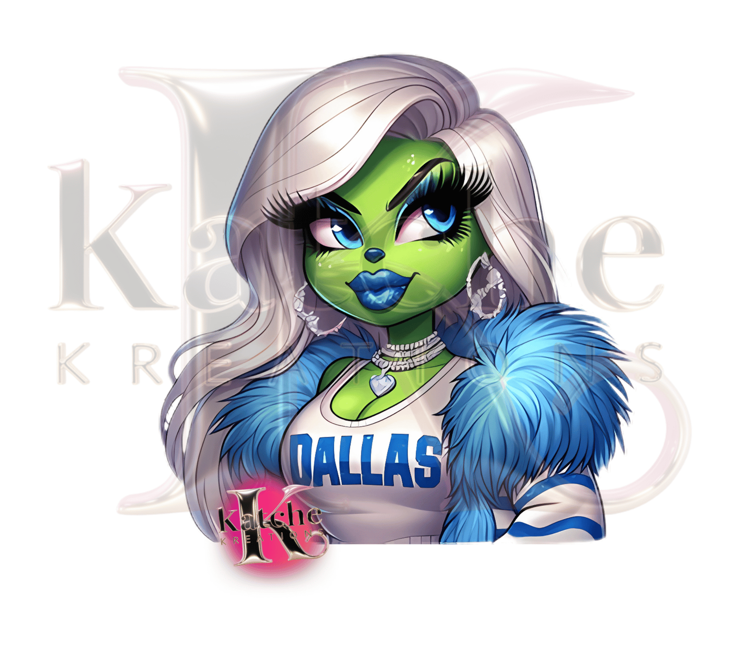 Add some elegance to the season with this “Blue Dallas Grinch”—a stunning twist on holiday style with her shimmering fur-lined coat, glamorous jewelry, and a look that says she's here to sleigh! Holding bright ornaments with a mischievous grin, she’s perfect for anyone looking to add a bit of cool glamour to their Christmas decor.