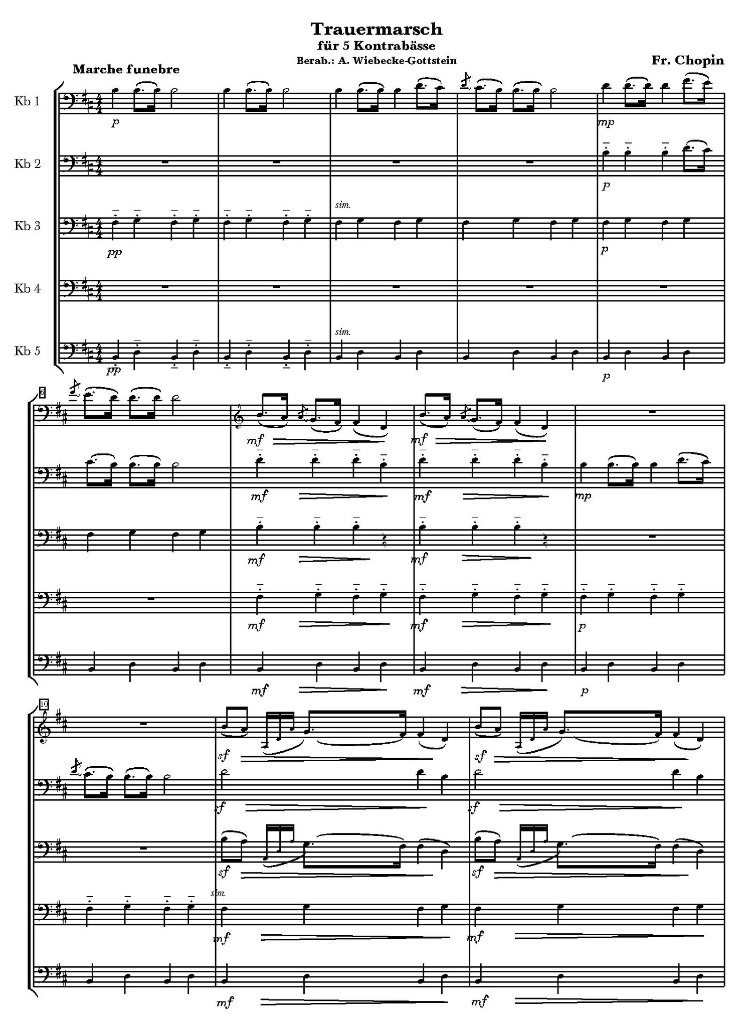 The famous "Marche funebre" by Chopin. The unique ensemble sound of the 5 double basses gives this work even more power and drama, and the cantilena of the middle section, in which the 1st double bass can usually revel in the highest registers, is lifted into new spheres by the harmonics of the other basses.