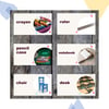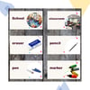 classroom, eraser, pencil, pen, marker, crayon, ruler, pencil case, notebook, chair, desk, whiteboard, teacher, student, pencil sharpener, scissors, pin, calculator, paperclip, and stapler.