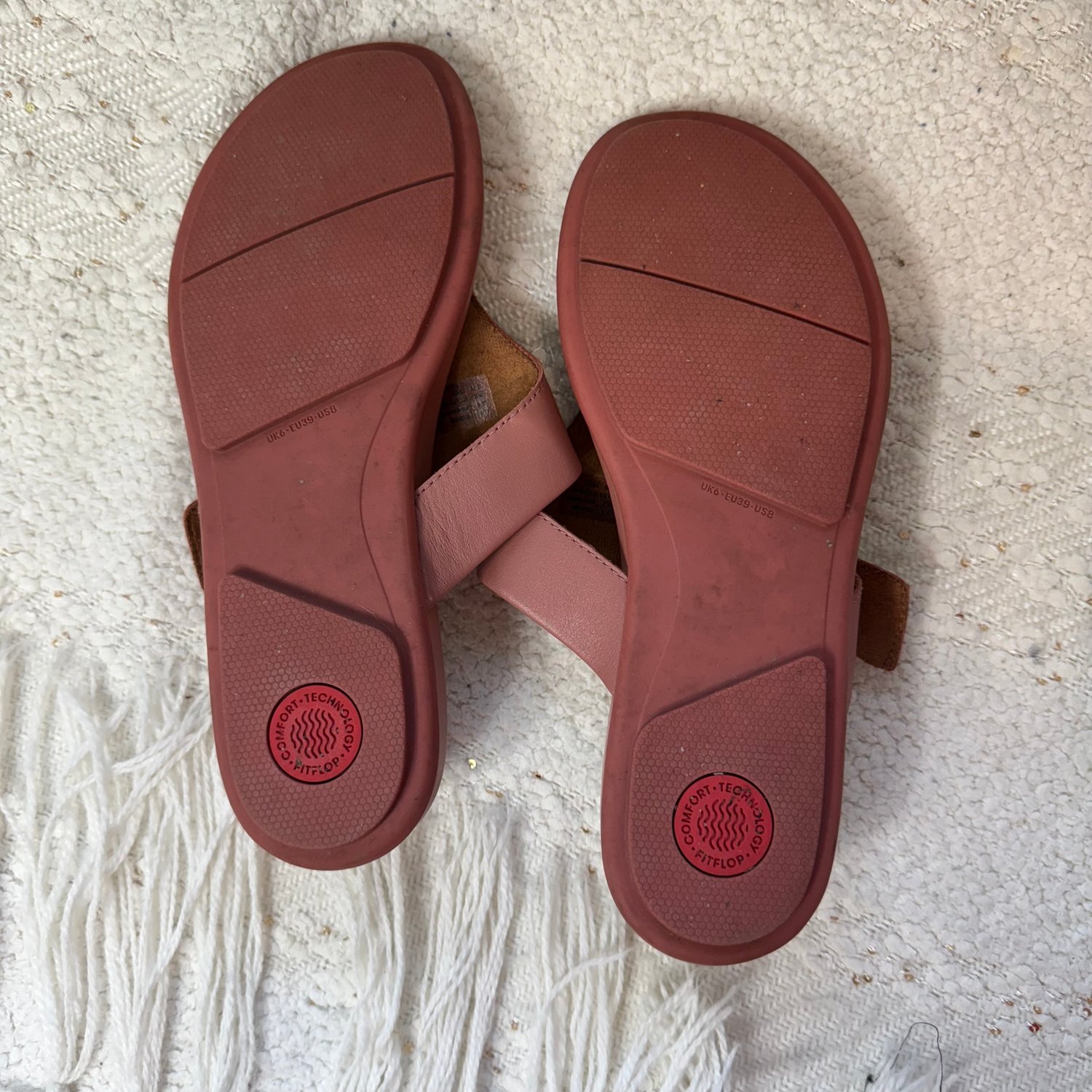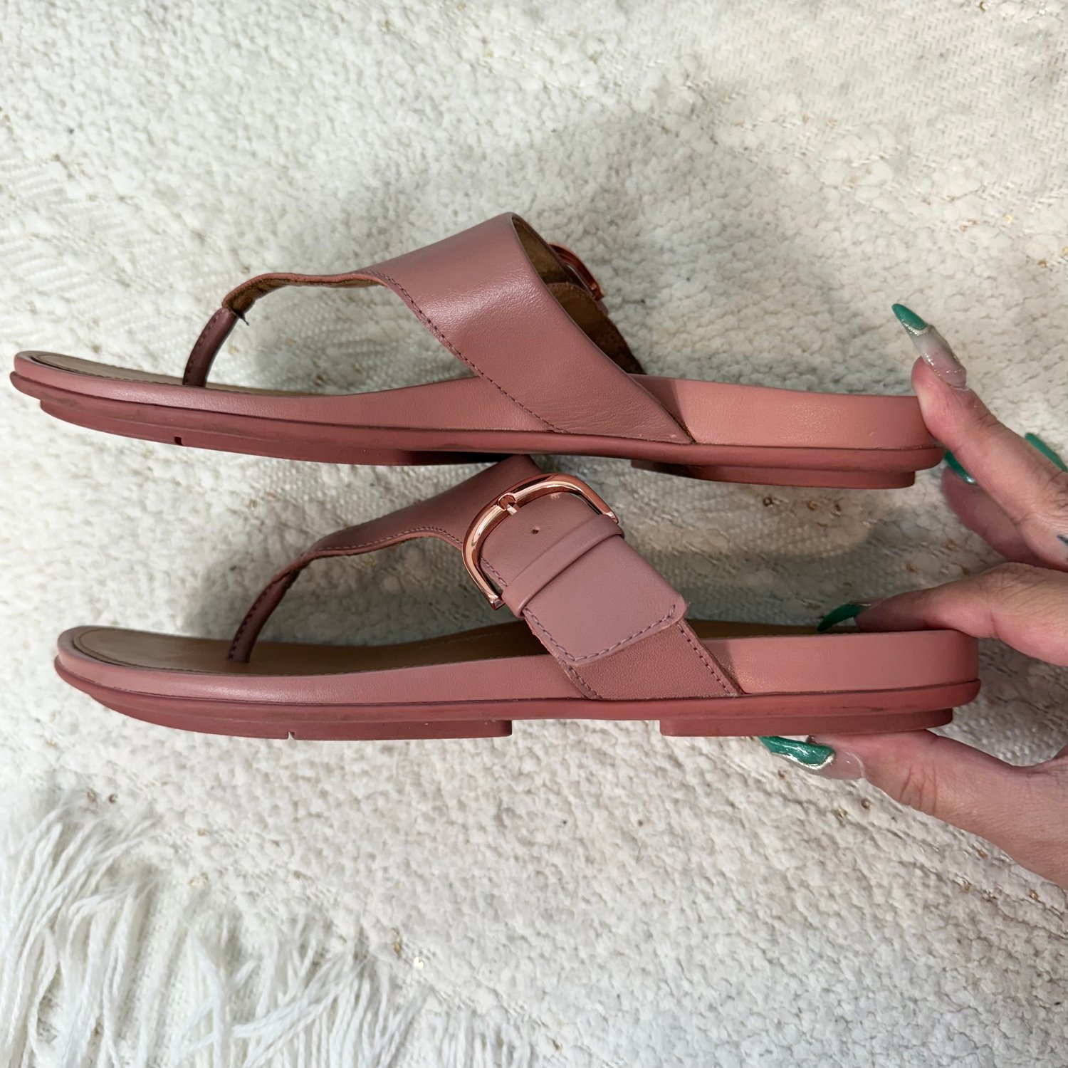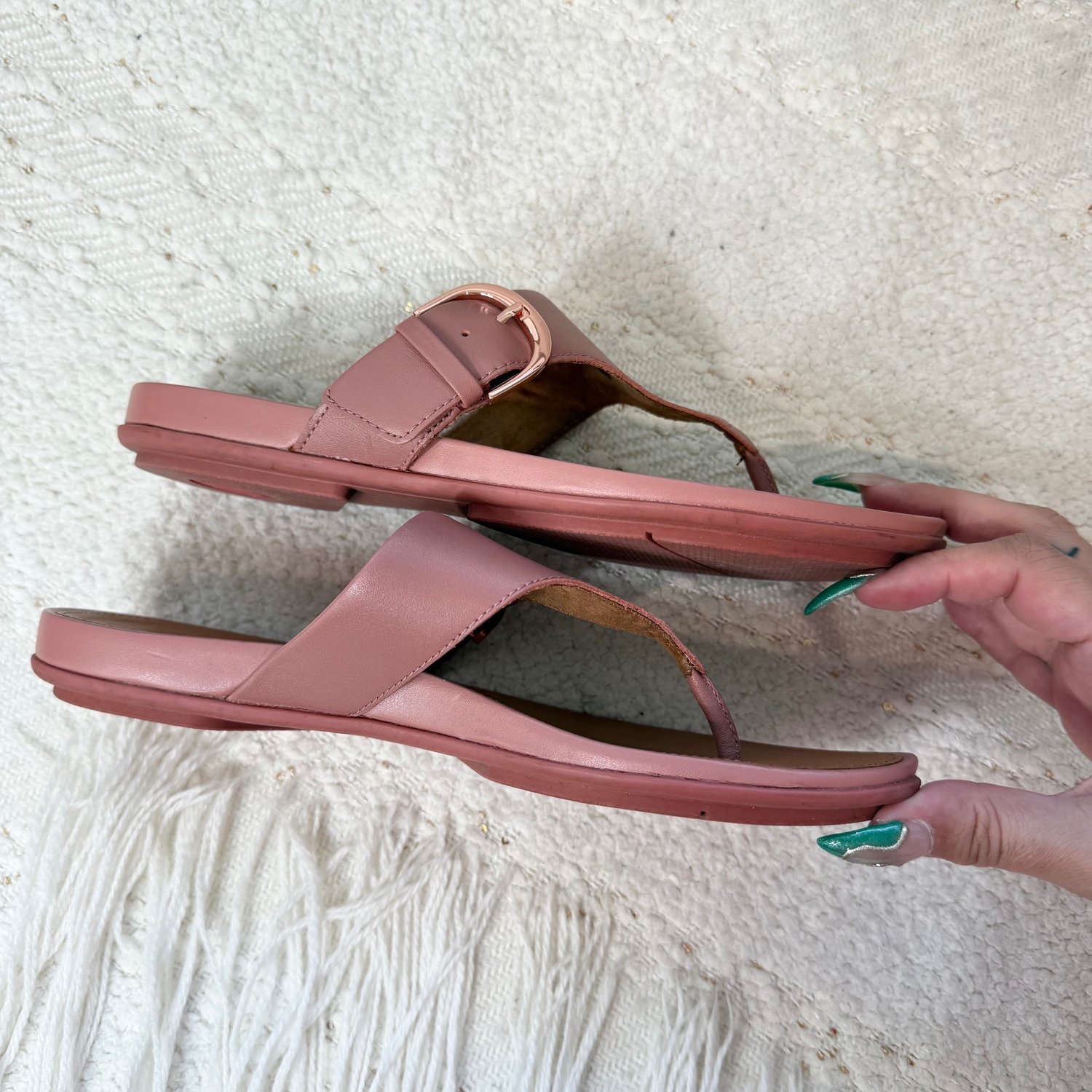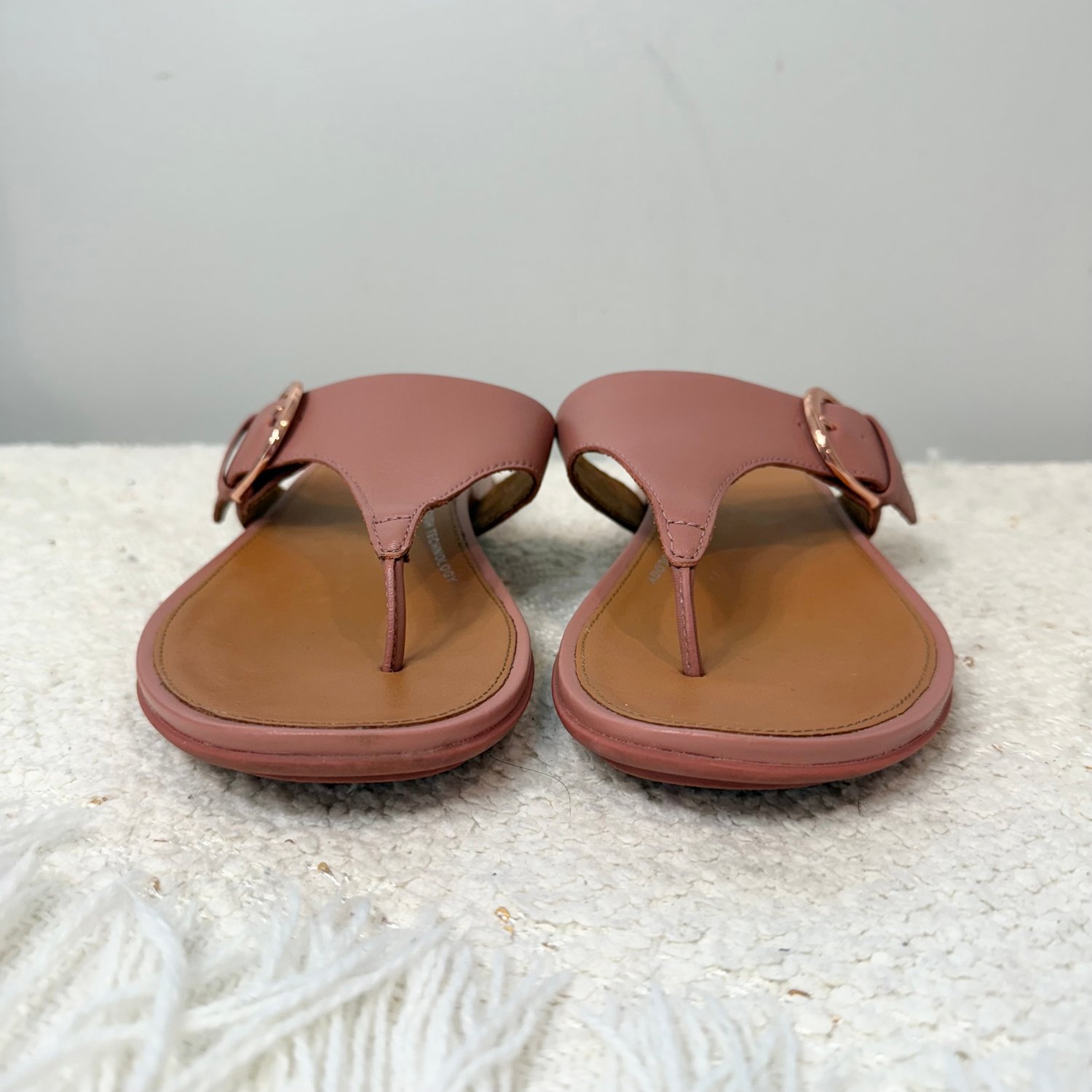 FitFlop dusty rose leather thong sandals with rose gold tone hardware. Buckle does function.