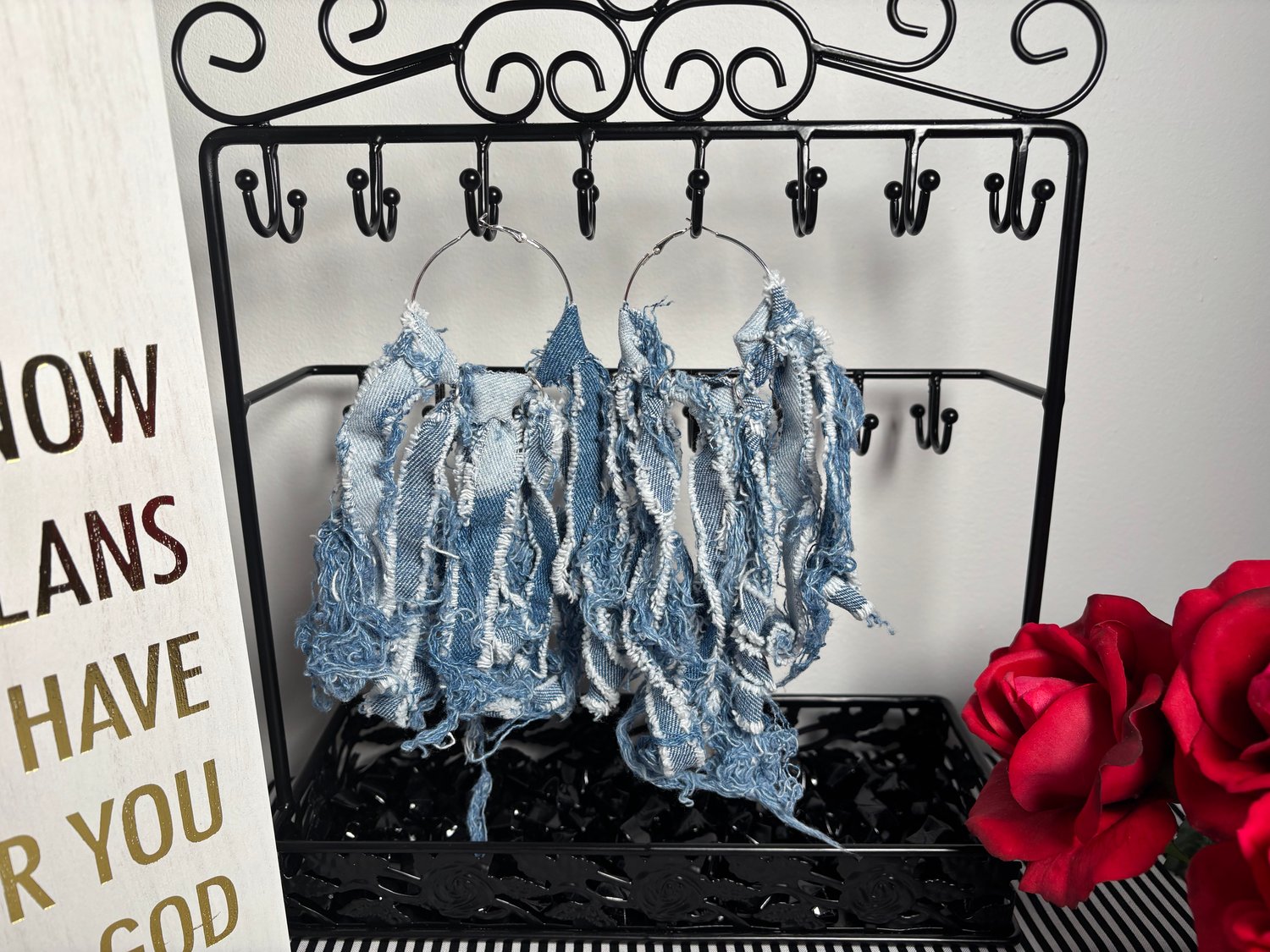 Handcrafted with care, the I Am Chosen hoops are wrapped in layers of upcycled denim with softly frayed edges for a unique, distressed look. Their lightweight construction makes them comfortable for everyday wear, while their bold design makes a confident fashion statement.