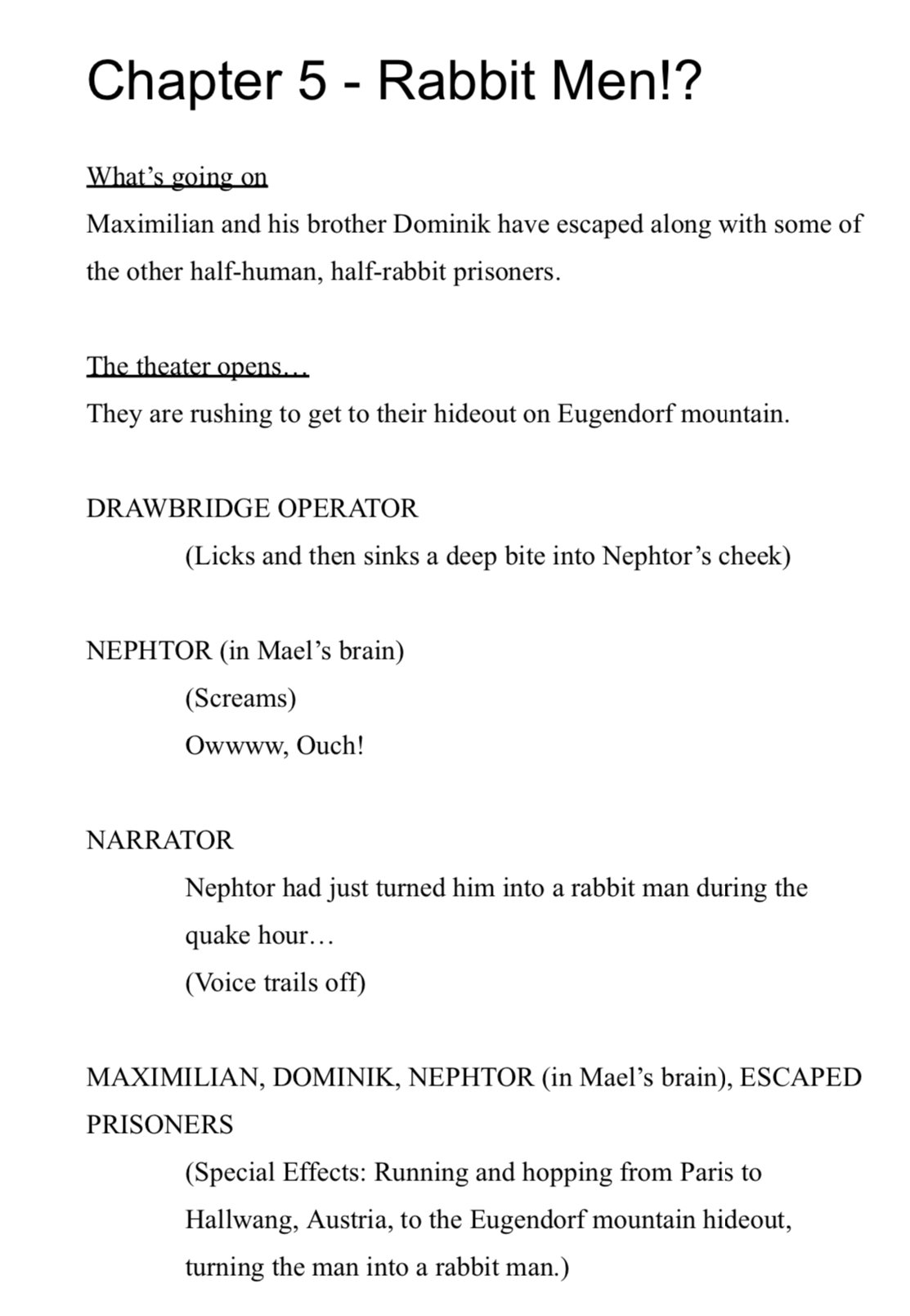 This is the Dialogue Novel of the book Nephtor and the Rabbit Men. This horror story takes place in Neptune, Intergalactic Space, San Francisco, Paris, and Beijing. Triplets from the planet Neptune have been expelled to Earth due to an amoebic infection that made their brains concave. Most of the day, their brain is in a constant Shake, but a random hour each day, it is in Quake mode. While in Shake mode, all cells are traversing the cerebral cortex, and anyone they touch becomes joyous. But during the dreaded hour of Quake, any person they touch turns into a devious human-sized rabbit.