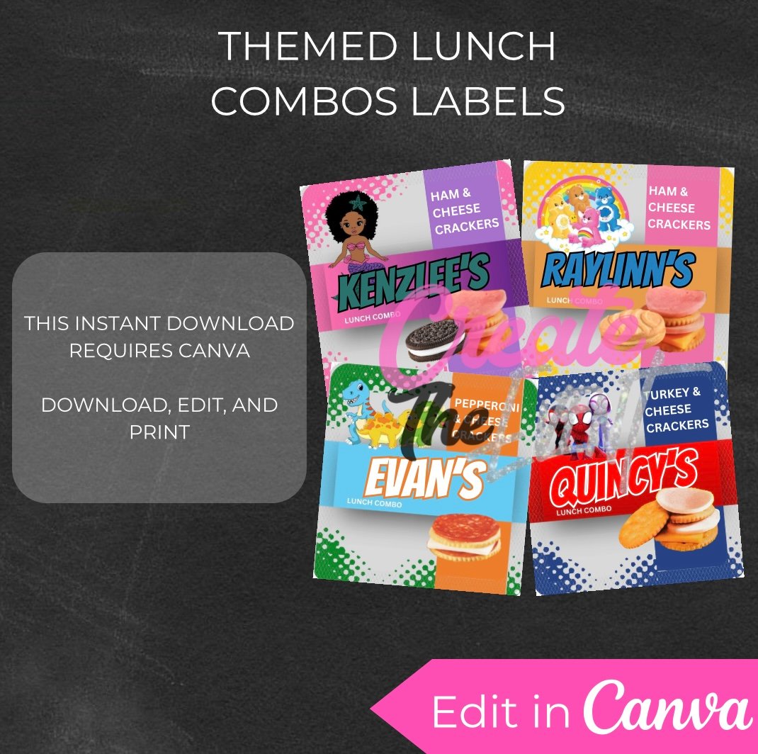 Serve up the cutest lunch table flex with this Lunchable-inspired Themed Combo Label Set. Designed with colorful, character-based styles, this bundle includes 4 non-editable lunch labels—perfect for custom party favors, birthday lunch boxes, daycare meals, or boutique treat kits.