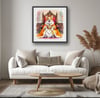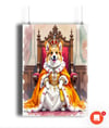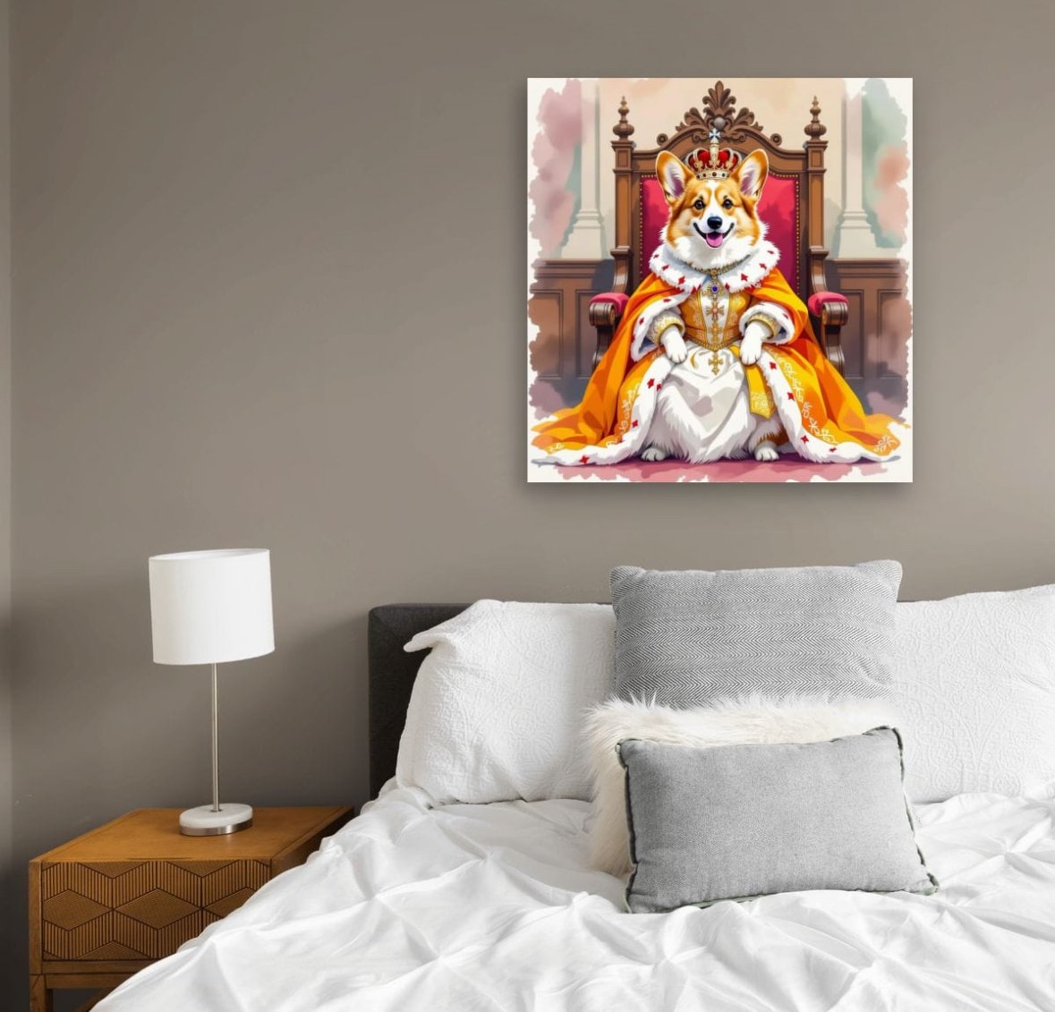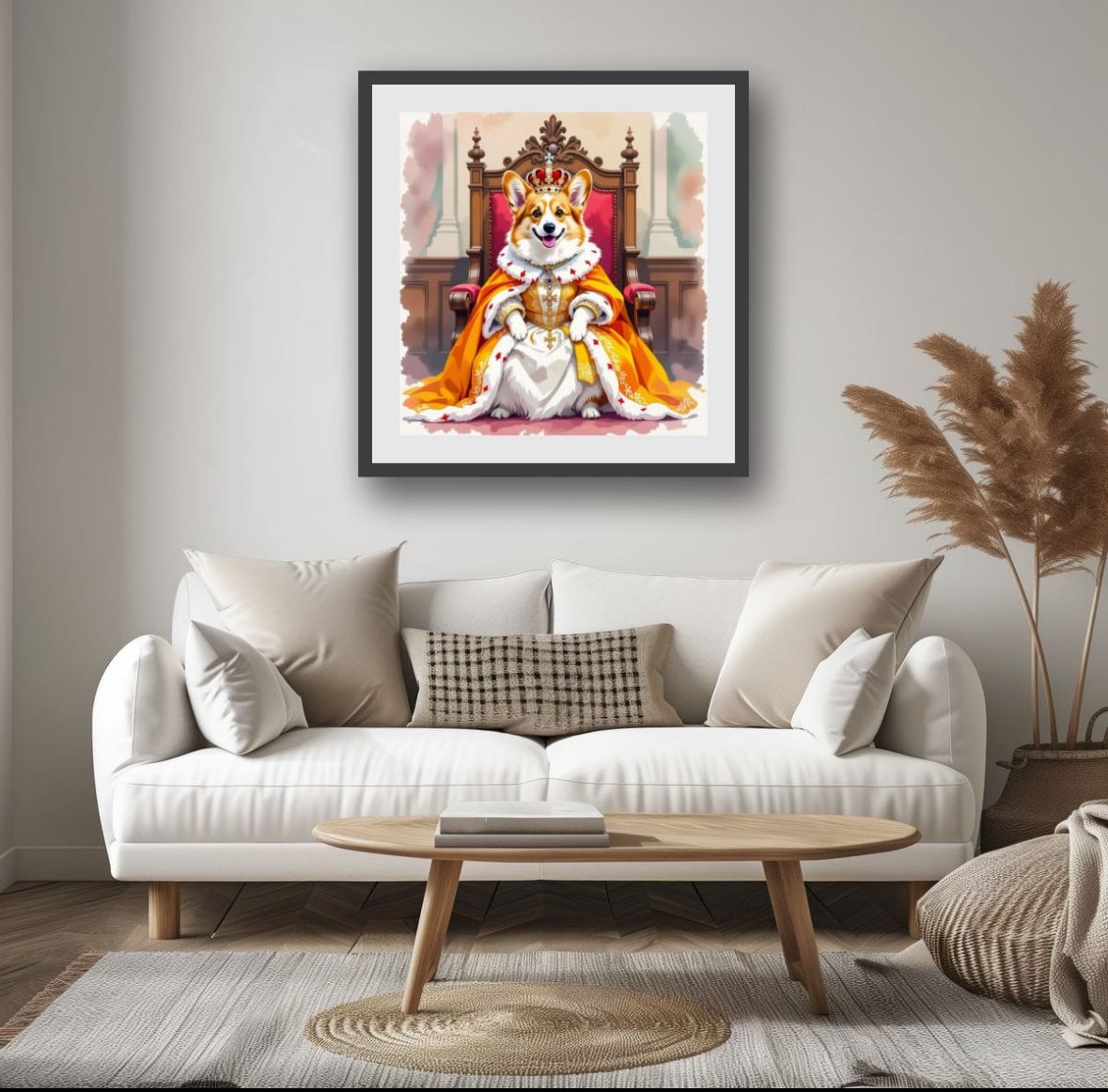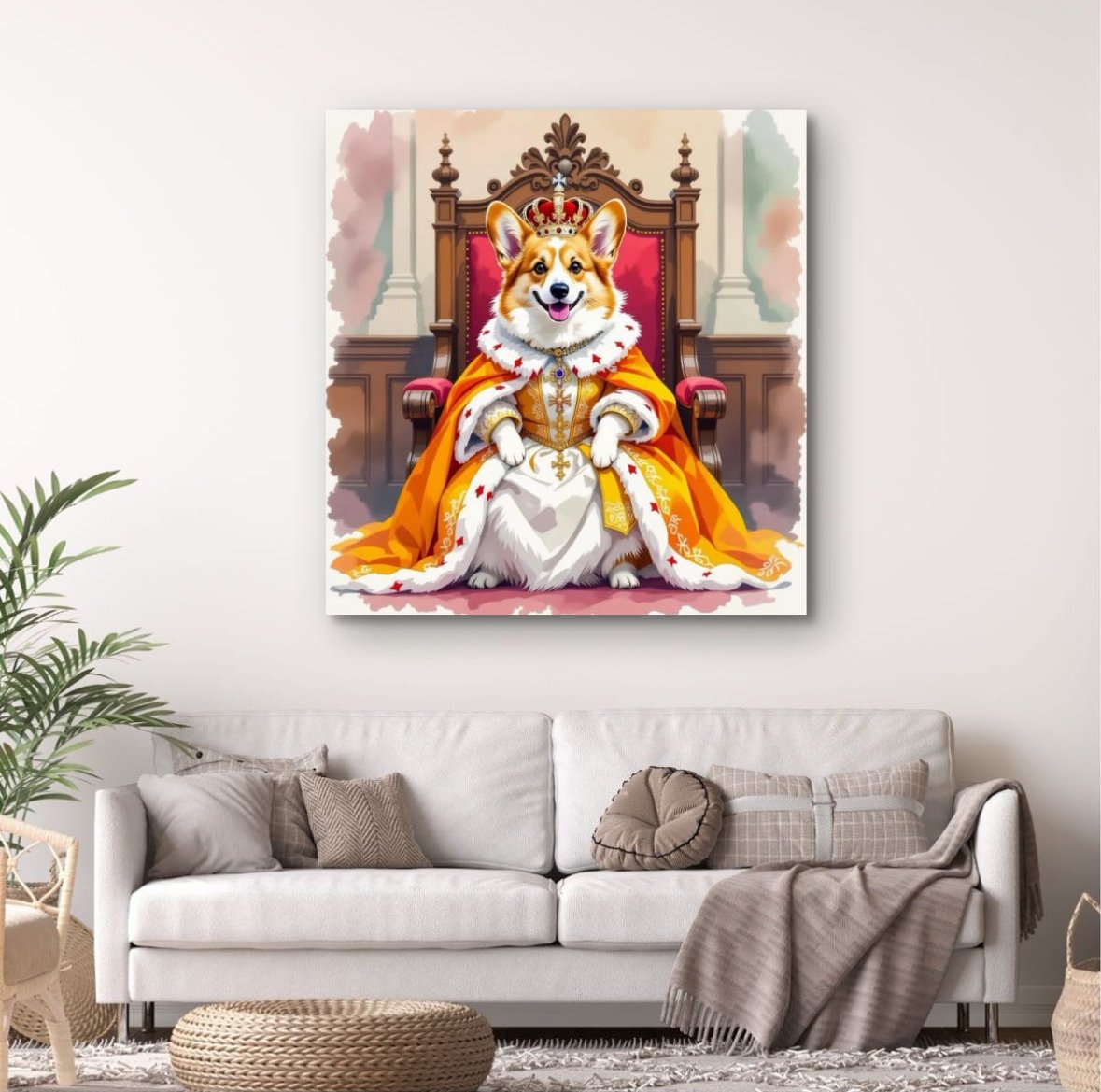 This unique piece portrays the beloved corgi in full royal regalia, seated proudly on her throne during her grand coronation. A perfect blend of whimsy, elegance, and humor, it makes a standout addition to any space — whether you’re a dog lover, a fan of British royalty, or simply someone who enjoys art with personality.