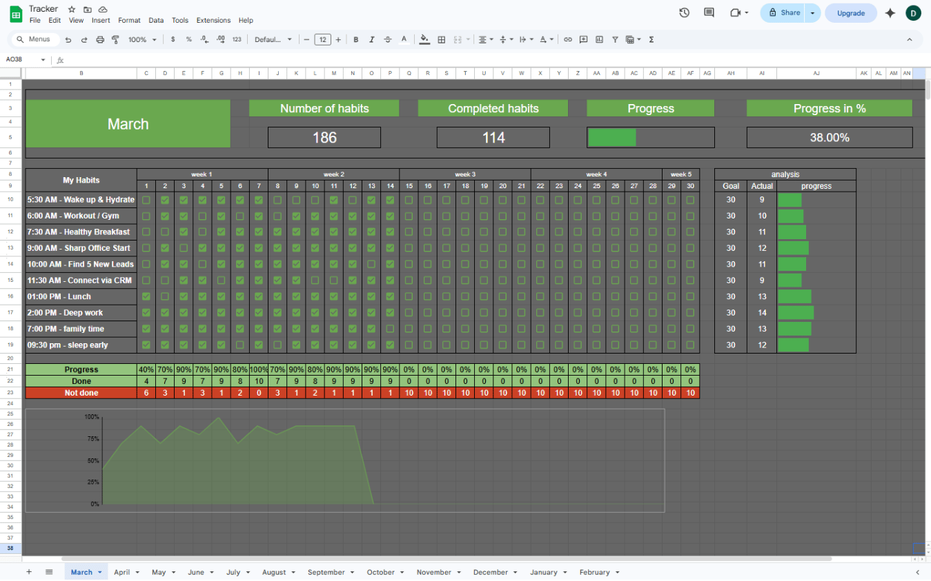 - Real-Time Analytics: Visual progress bars and dynamic area charts update instantly as you check off your tasks.