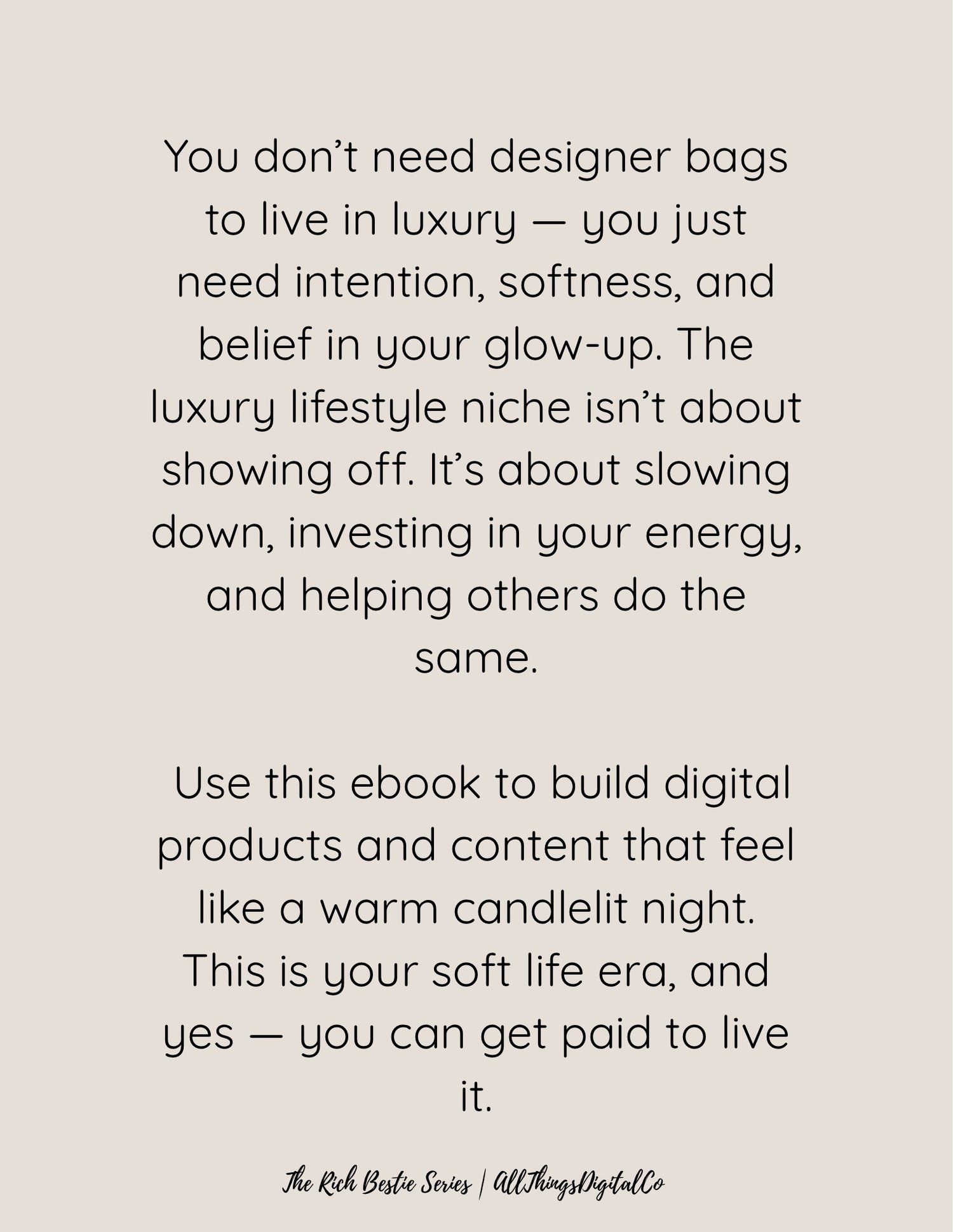 Luxury is a vibe — and it’s a powerful niche. This ebook shows you how to create aspirational content, market digital or affiliate products, and build a faceless brand that oozes soft life energy. You don’t need a Chanel bag to sell the lifestyle — just smart strategy and aesthetic storytelling.