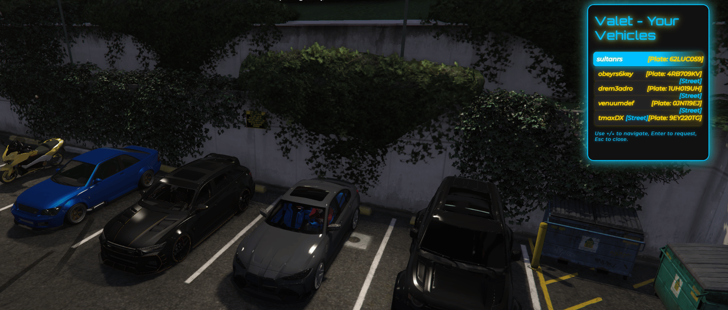 Legendary QBCore Valet System — NPC Vehicle Delivery & Street Retrieval Neon UI • NPC valet delivers safely • Street retrieval • Global anti-collision queue • Plug-and-play for latest QBCore servers.